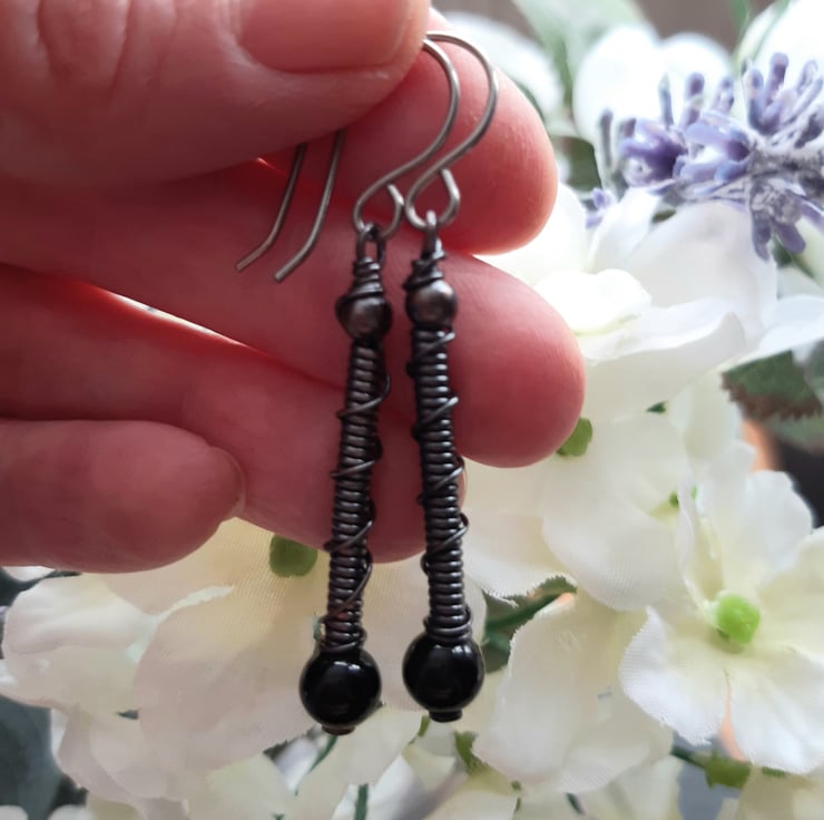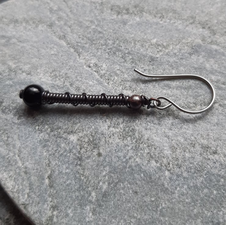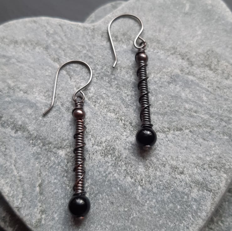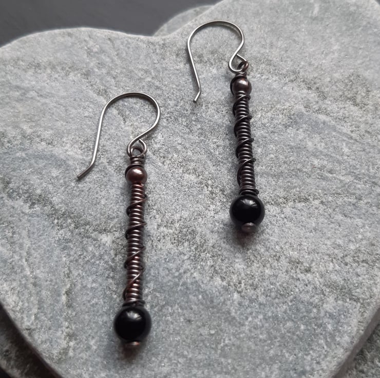 copper wire wrapped drop earrings with black agate precious gemstones are attached to handmade niobium ear wires which are hypoallergenic