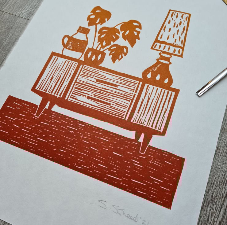 Limited edition, Original Lino Print of a mid century interior in my own home.