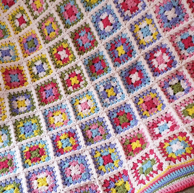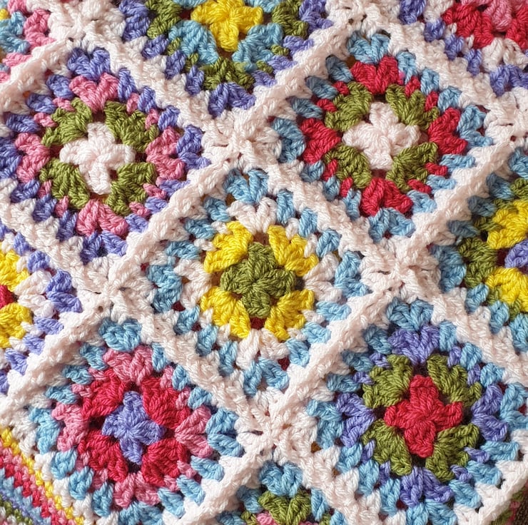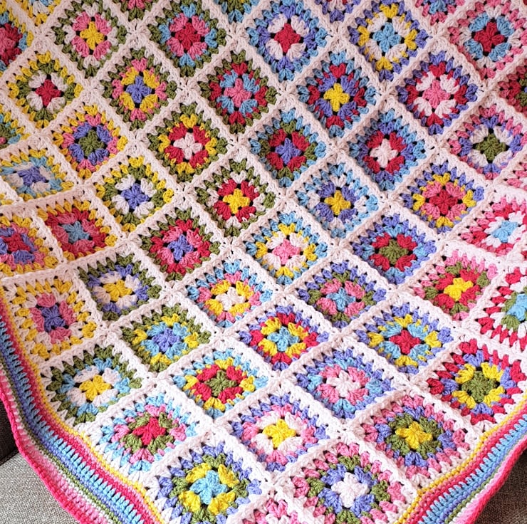 Hello Summer Blanket - gorgeous Summery colours. A selection of granny squares in a colour wash effect with a wide colourful decorative border.