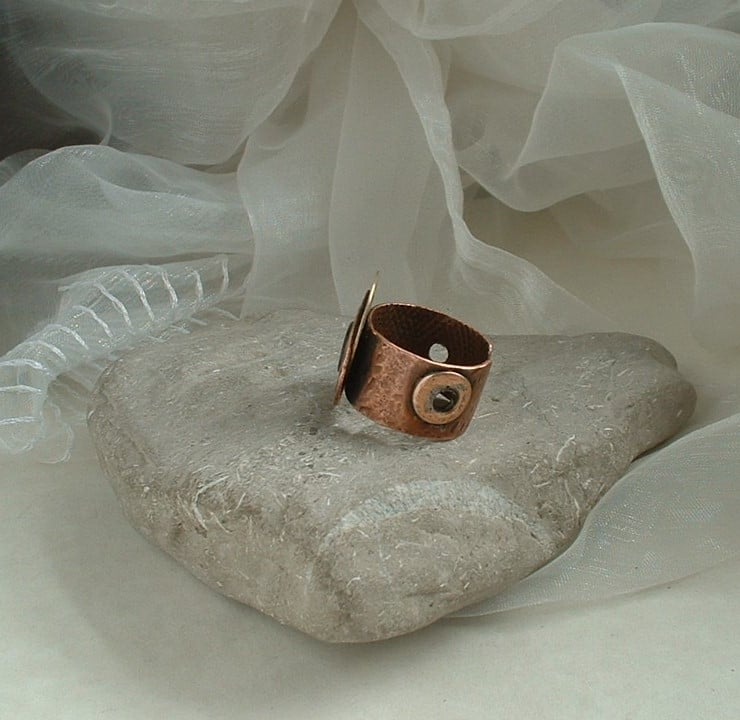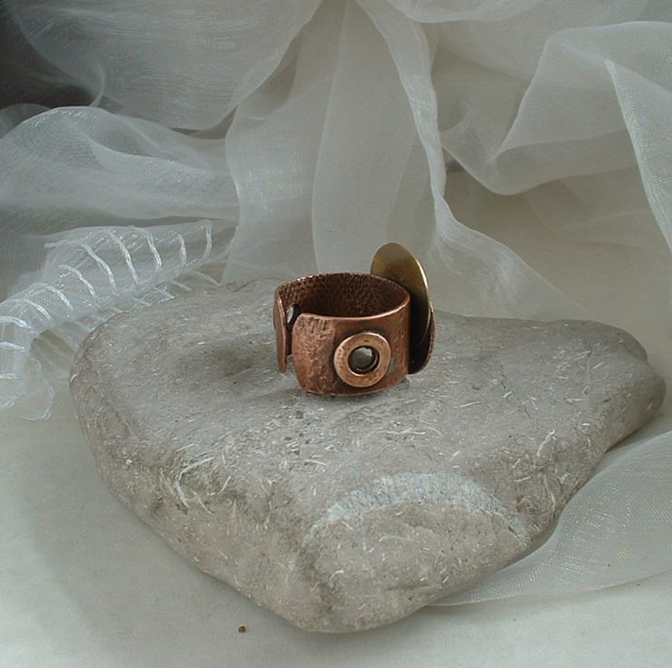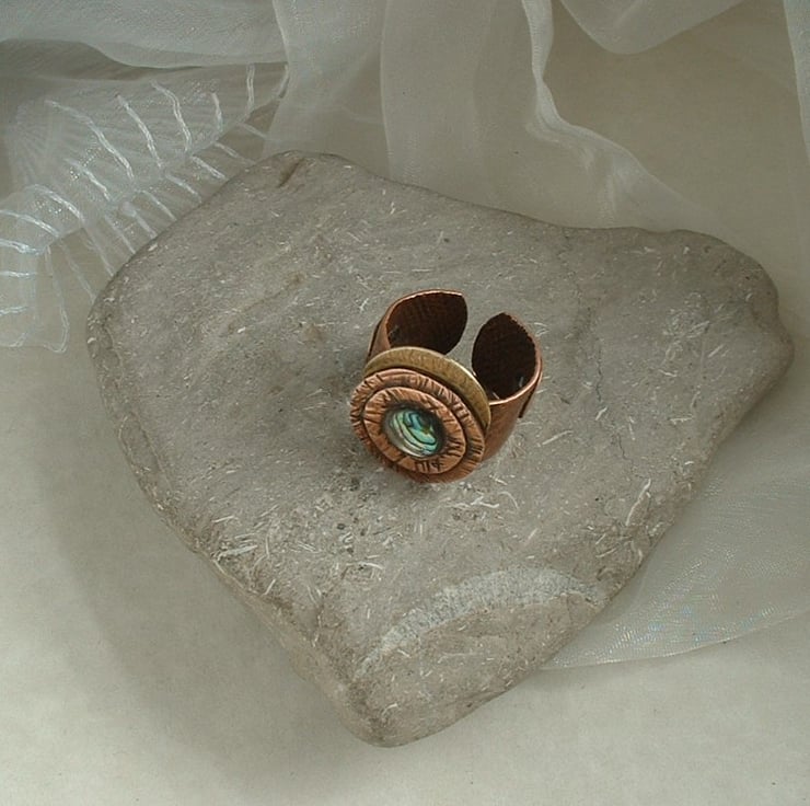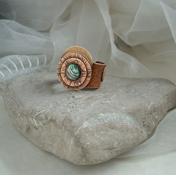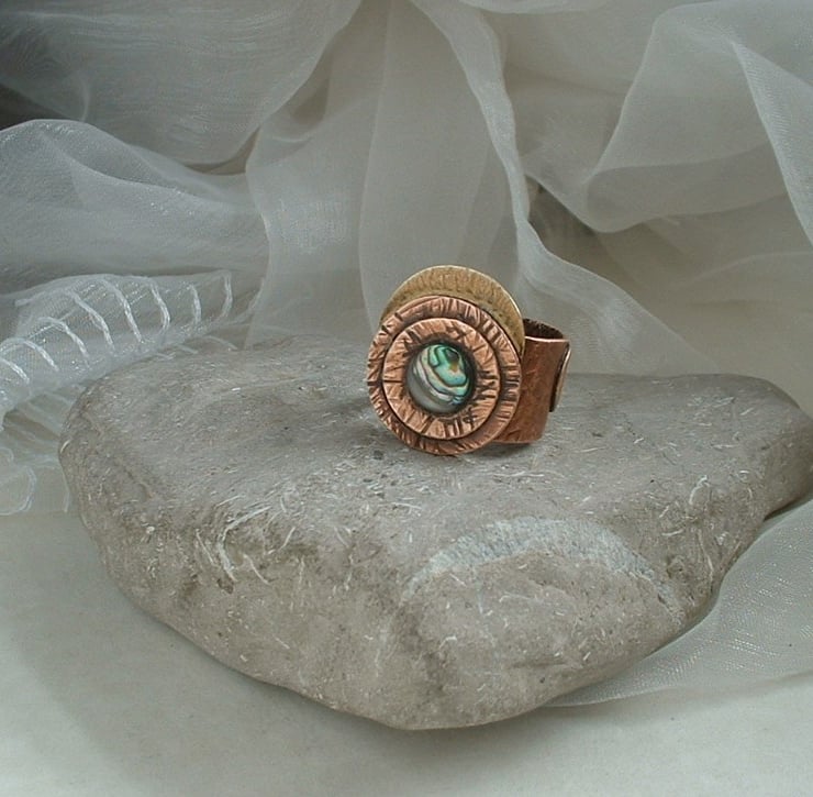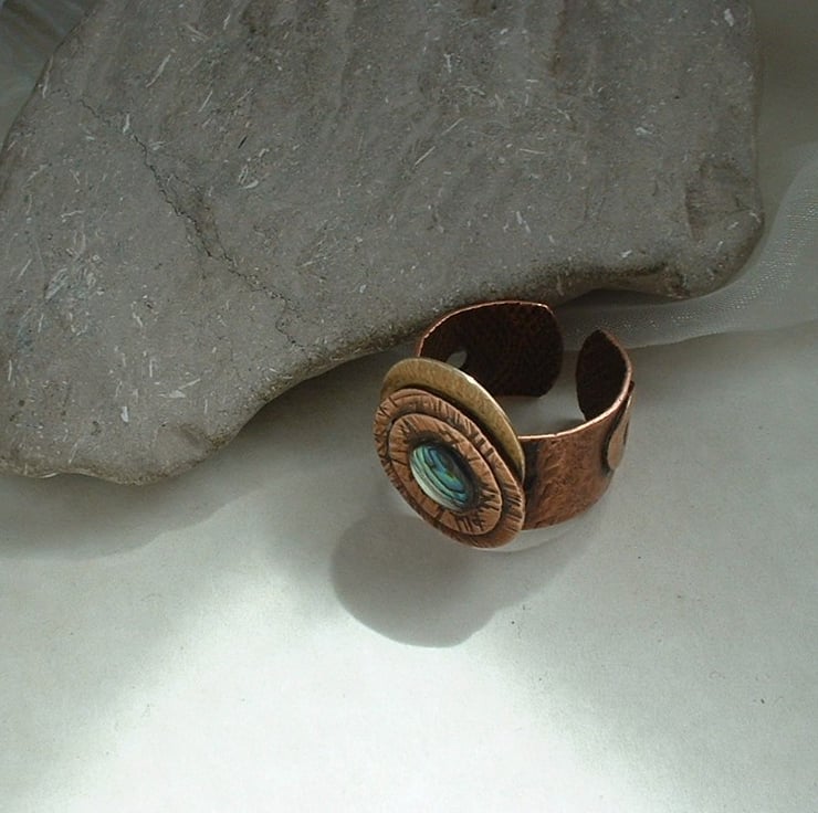 A stunning design depicting a sunrise created from textured copper washers soldered to an etched piece of thin brass plate and riveted to a wide textured copper band. Two small copper washers are soldered to the band and holes drilled through to add another design element. A circle of blue green iridescent shell is cemented in the centre. Oxidised to give an antique finish and sealed with a silicon wax polish.