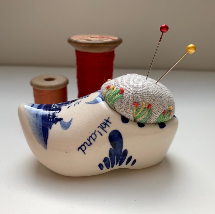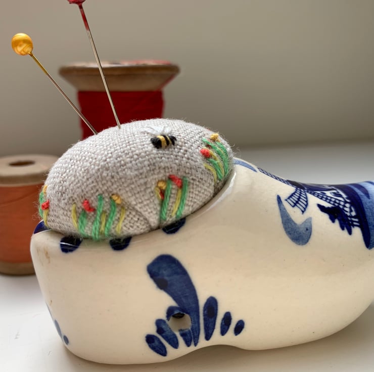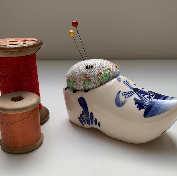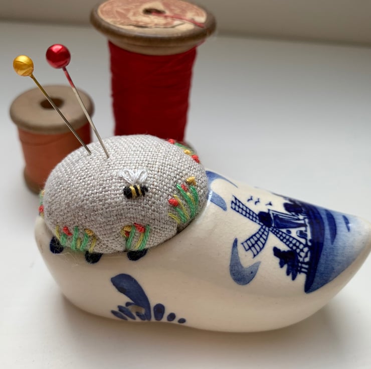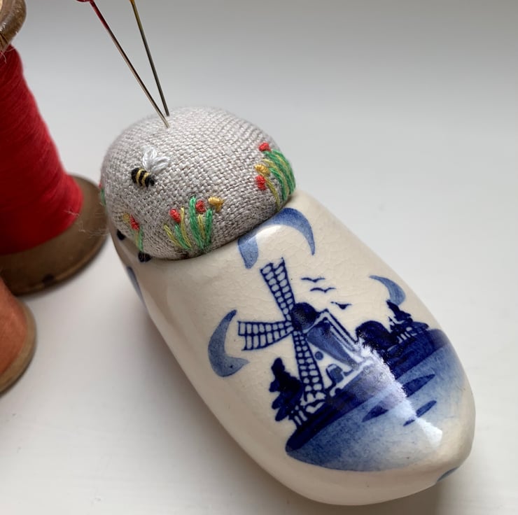 Cute little pincushion in a china clog. The hand painted clog holds a linen cushion which has been embroidered with tiny flowers and a bee.