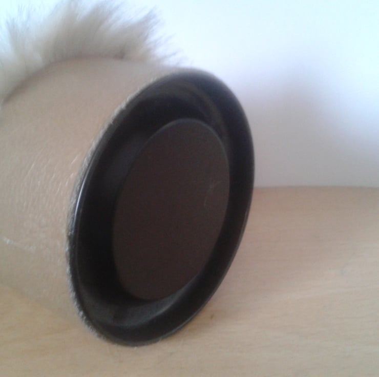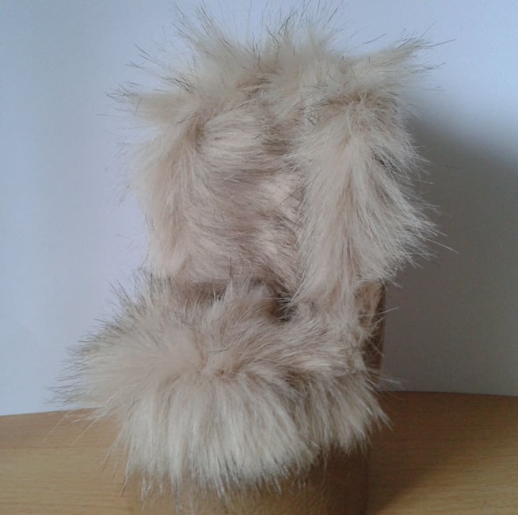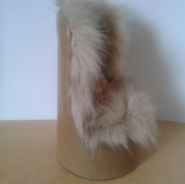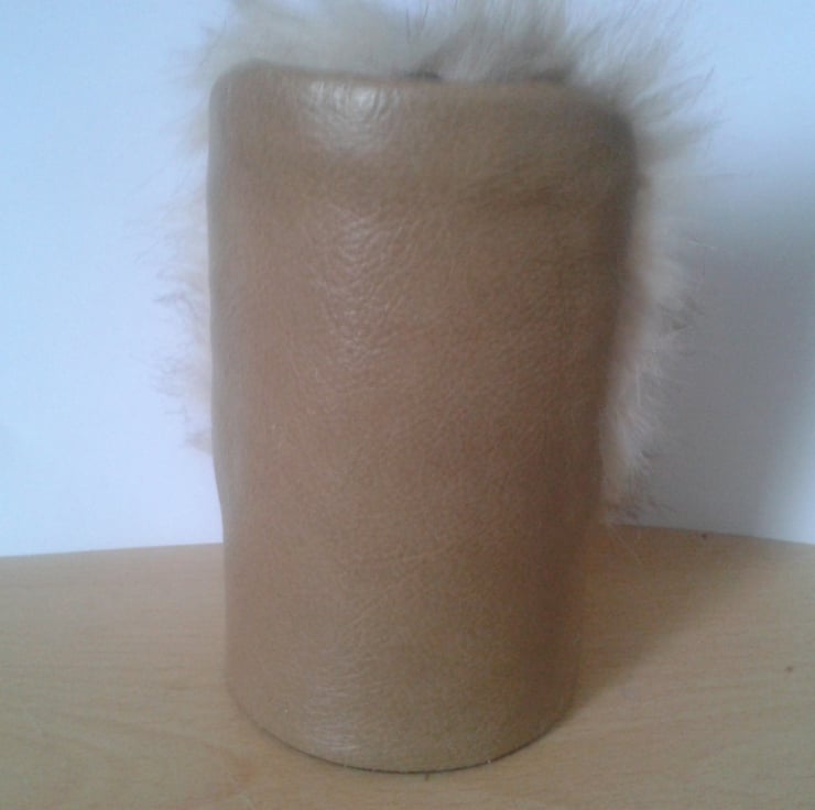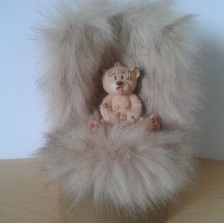 small chair, light brown leather round edge and padded faux fur seating, made around a thick cardboard frame and black metal base 6 ins high x 3.5 ins wide approx, looks great, little ted not included