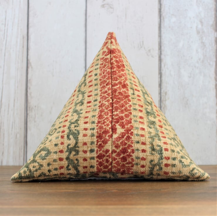 A triangular pyramid door stop made from a Monkwell Batumi tribal print furnishing fabric in terracotta orange and green. Approximately 19cm along each side.