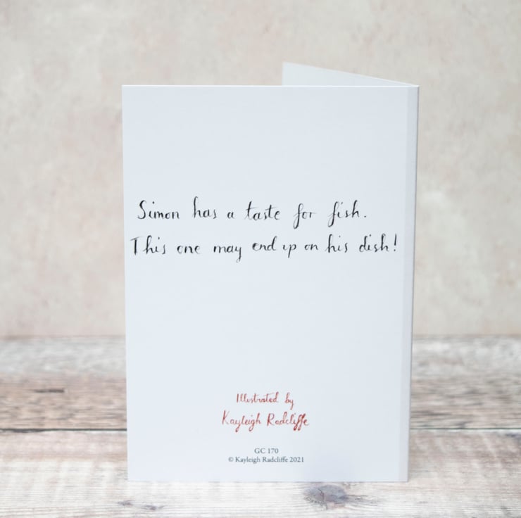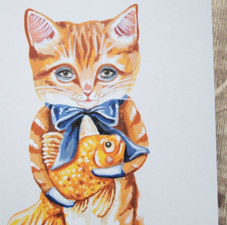 An A6 greeting card featuring my painting of a ginger kitten called Simon with a tasty looking goldfish!