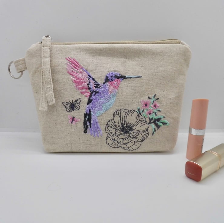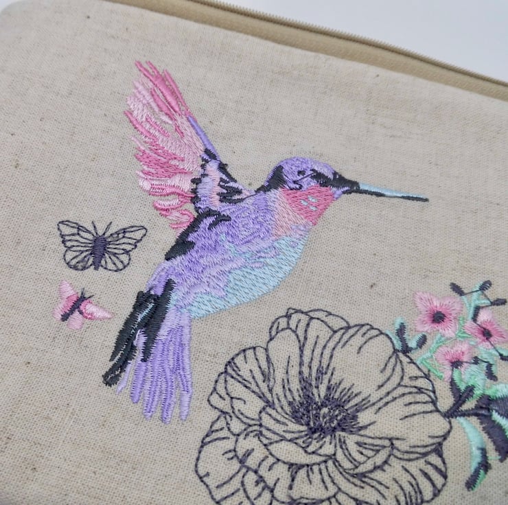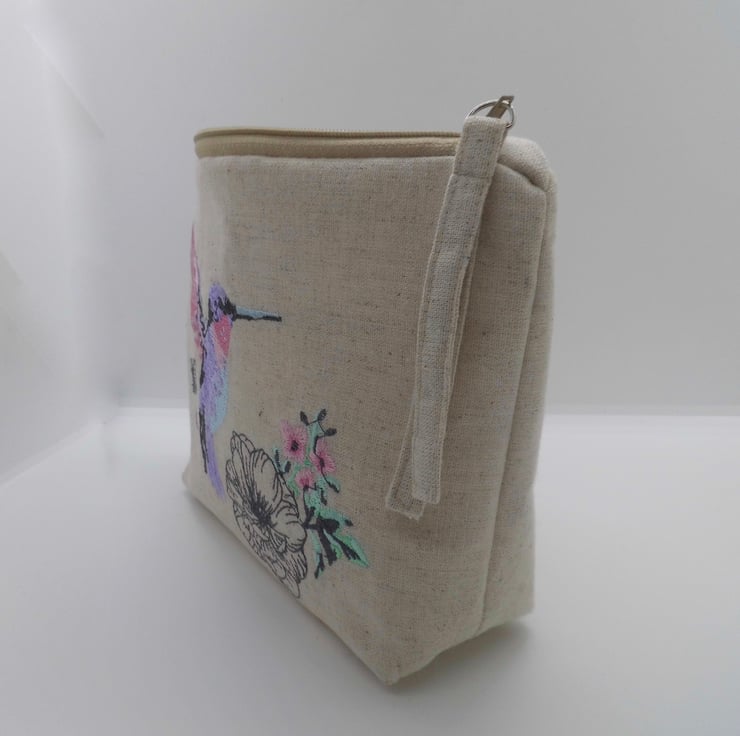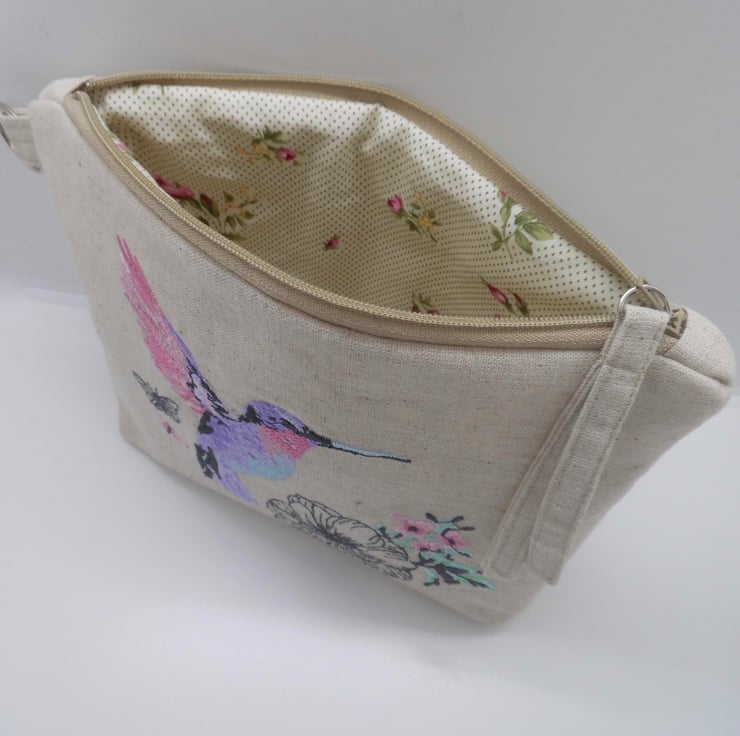 This make up bag has been made using an 80% cotton/20% linen mix fabric in a natural, oatmeal colour. I backed this outer fabric with fusible fleece to give it extra body and a quality feel. The front features a beautiful machine embroidery of a pink, mauve and blue humming bird hovering between a flower and two small butterflies.