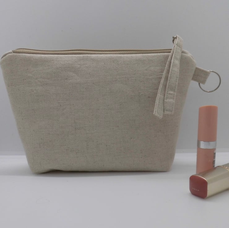 The bag is fully lined with a pretty cotton print. It has a beige zip across the top, finished with a fabric tab. There is a tab at the side with a metal ring, ready to attach a bag charm, keys or other accessories.