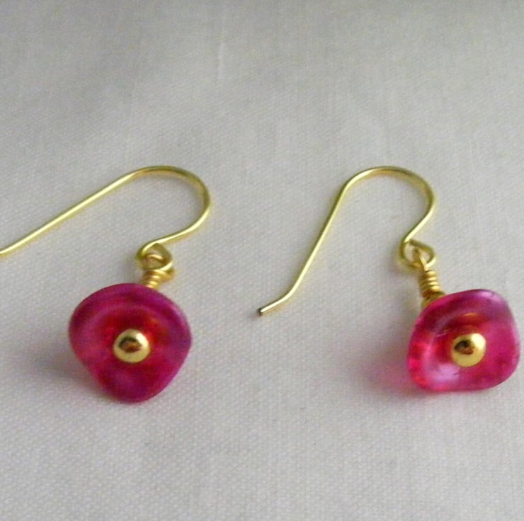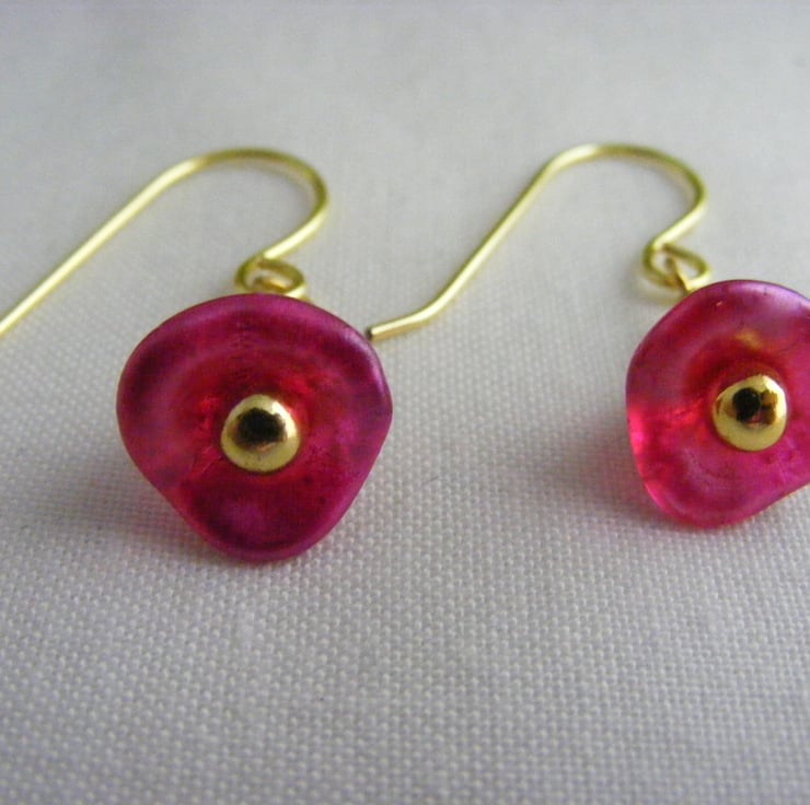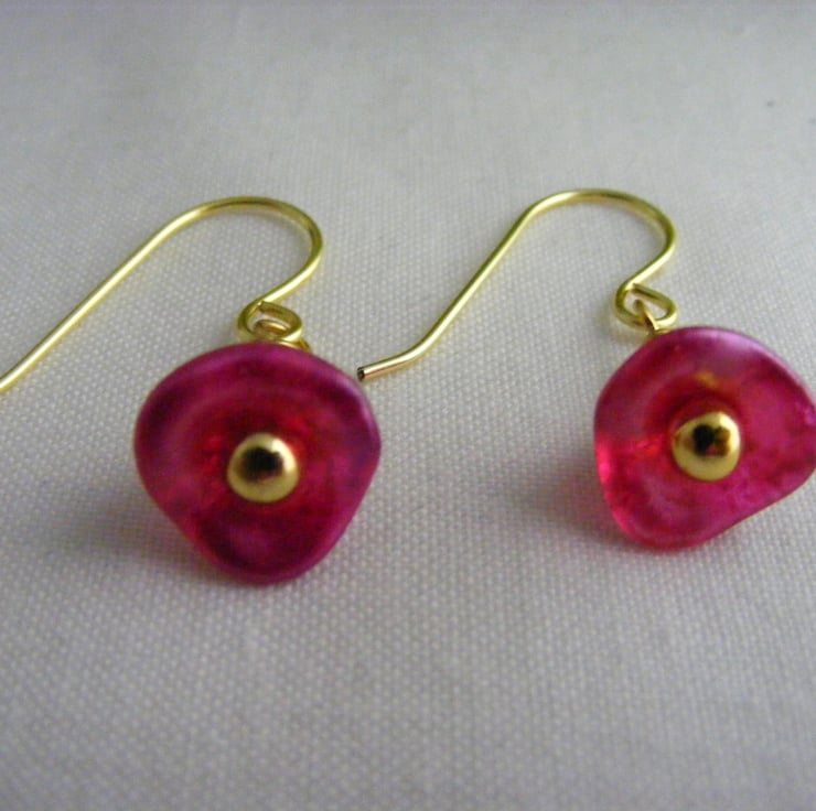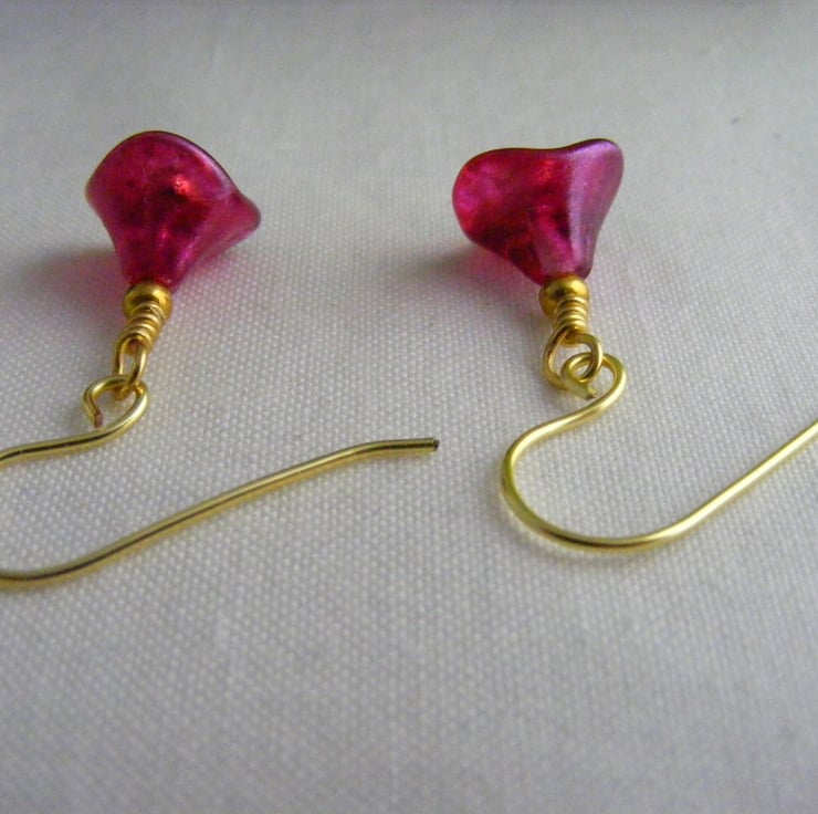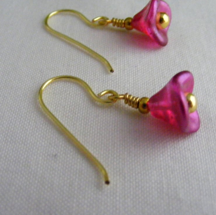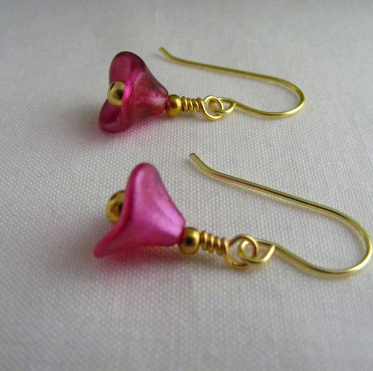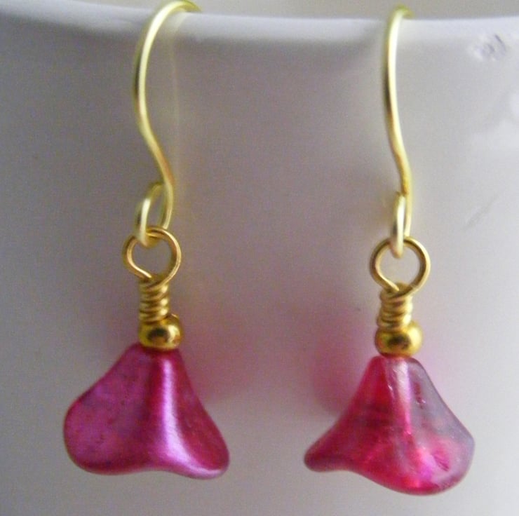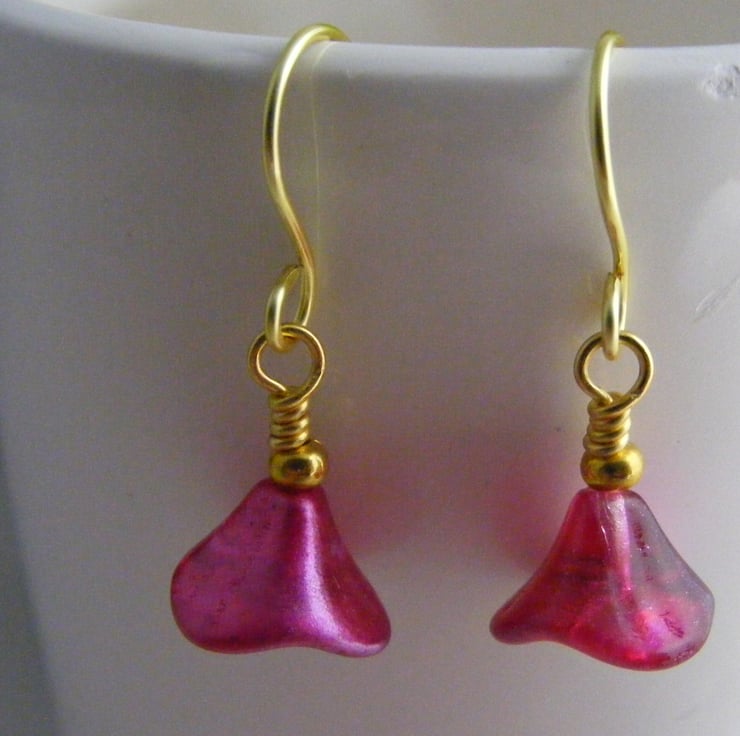 A lovely pair of earrings handmade with, 12 mm fuchsia satin 3 petal glass flowers,