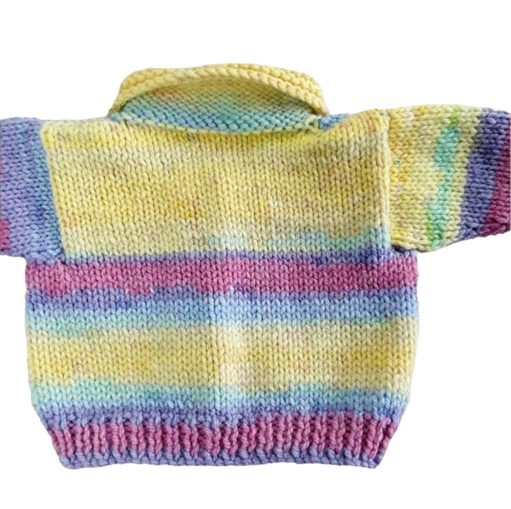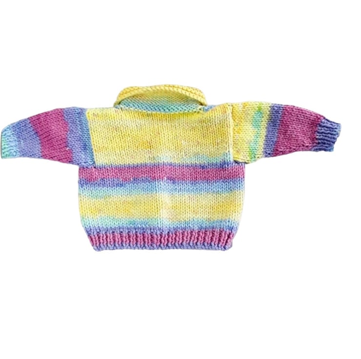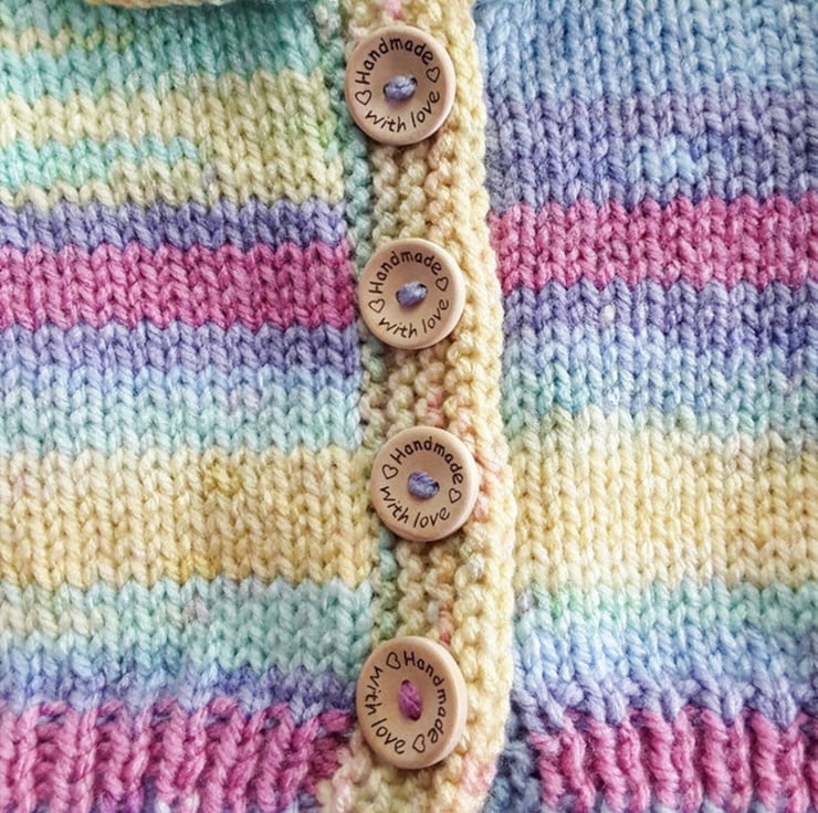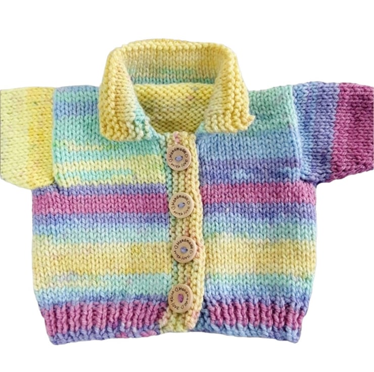Keep your little one snug and stylish with this adorable hand-knitted baby cardigan. Made with aran weight self-striping yarn, it’s designed to keep your baby warm while adding a pop of playful colour.