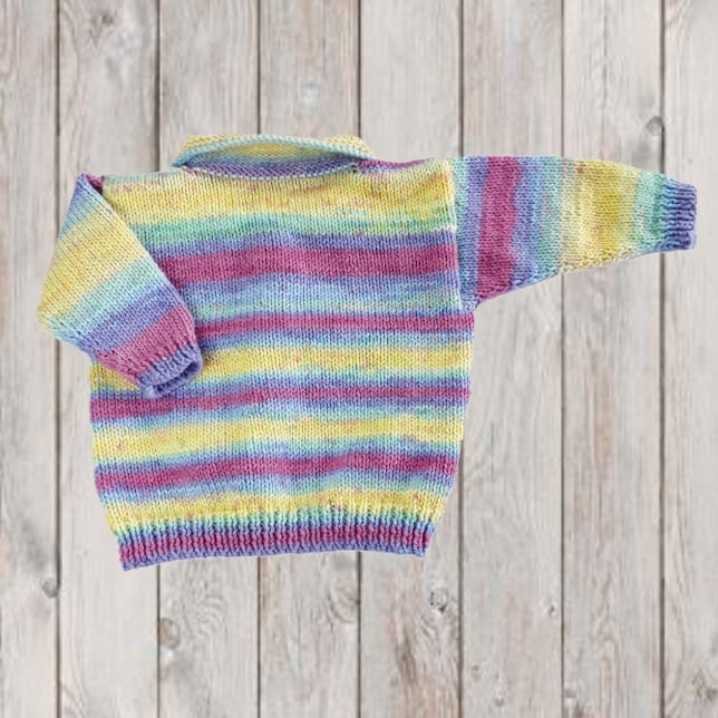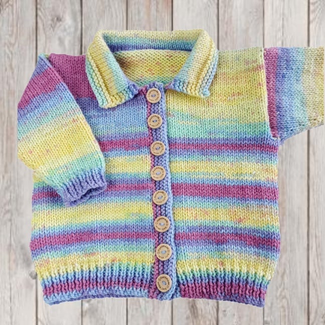 The yarn is self striping and I've just let the colours flow so this cardigan is totally unique with mismatched sleeves and fronts. It has a round neckline with a collar and fastens down the front with wooded buttons which are stamped with the words 'handmade with love'.