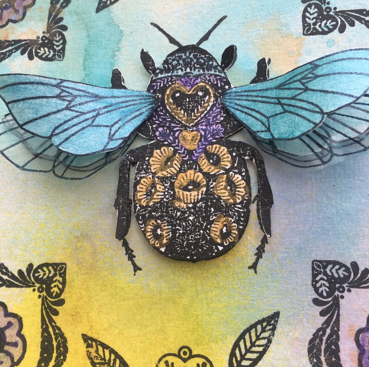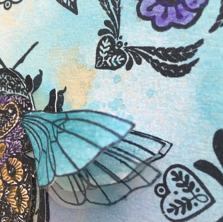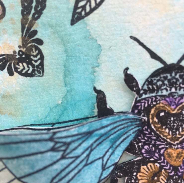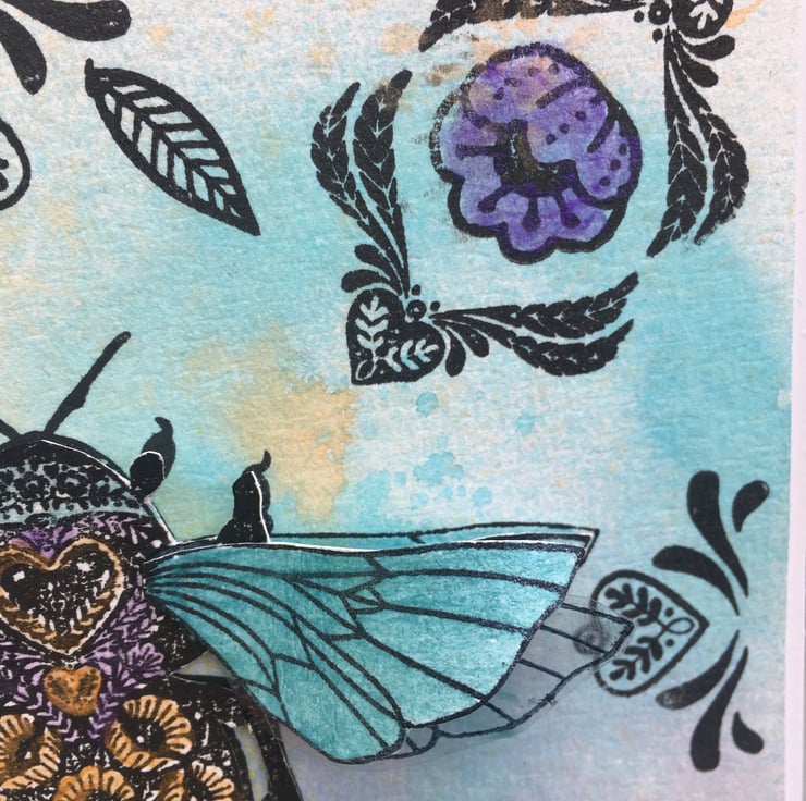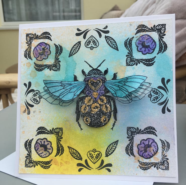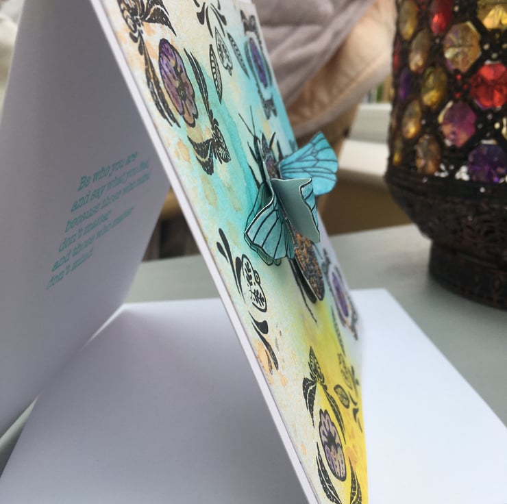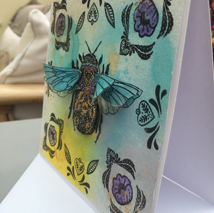 A flokart style cute bumblebee card. This 15x15cm card is colourful and cute. It features a bumblebee with three dimentional wings. Her back is covered in flowers and hearts and she has 3 sets of wings, iridescent blue and acetate to give her movement, she is just about to take off. She is surrounded by flowers, hearts and leaves all in the folkart style. The backing paper is sprayed with various colours giving it a layered, cloudy appearance. The greeting inside the card says 'Be who you are and say what you feel, because those who mind don't matter and those who matter don't mind.' Not for any specific occation, it could be for anything, just to cheer someone up.