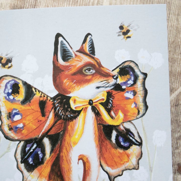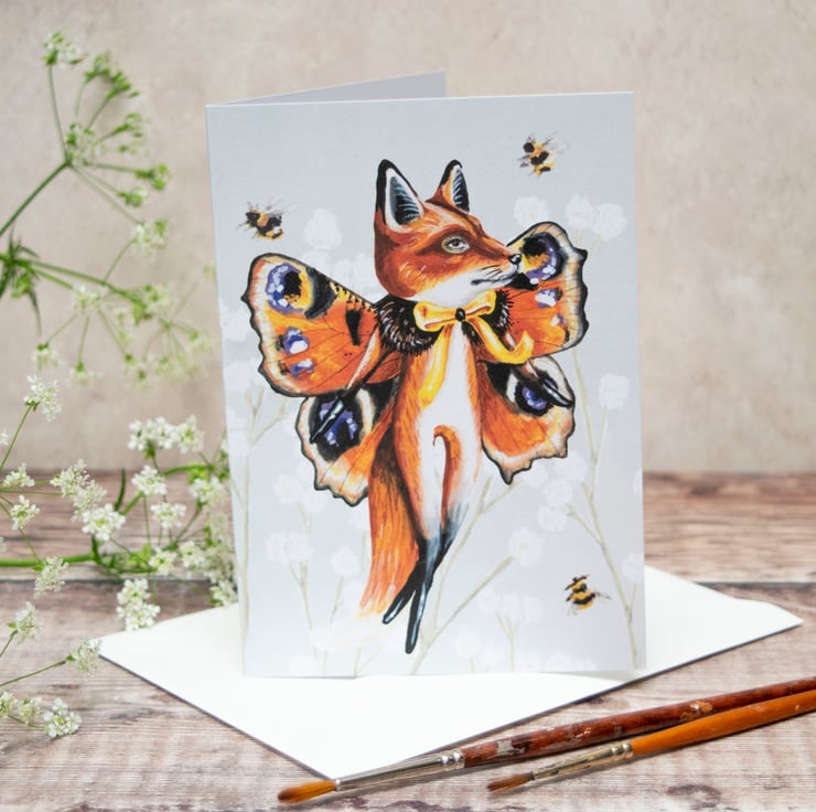 A self illustrated greeting card of my character Kevin the butterfly fox. I wonder if you get Kevin's in your garden? ;-)