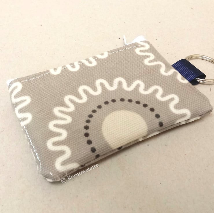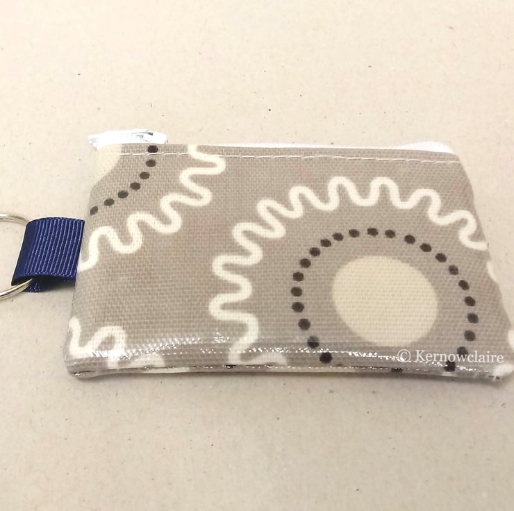 This is a lovely mini coin purse key ring, handmade in a grey oilcloth with a white zig zag pattern. Perfect for a few coins and will hang nicely from your keys or handbag.