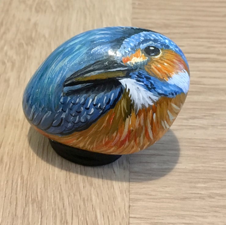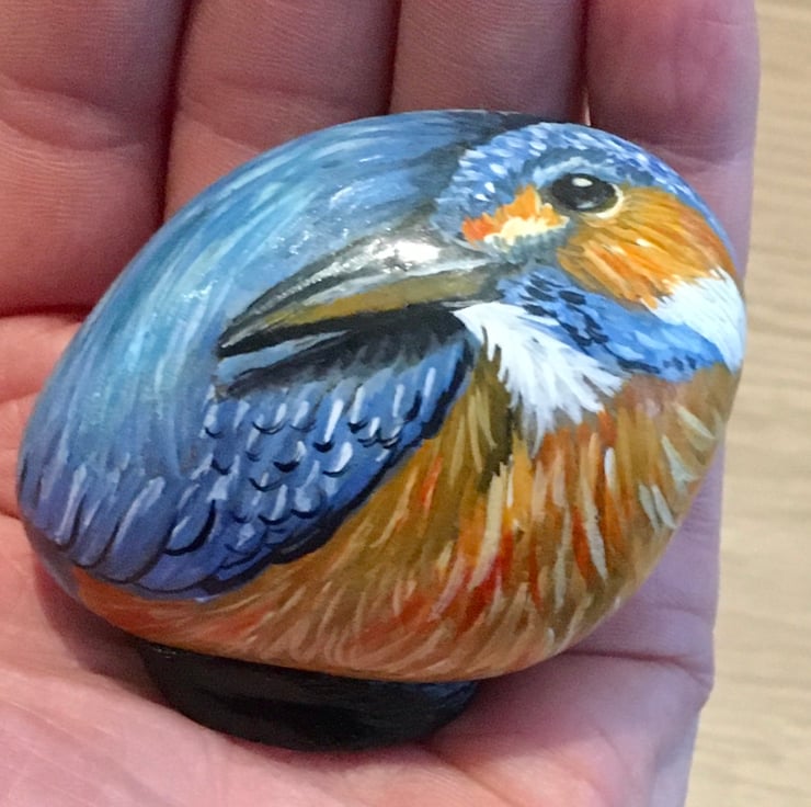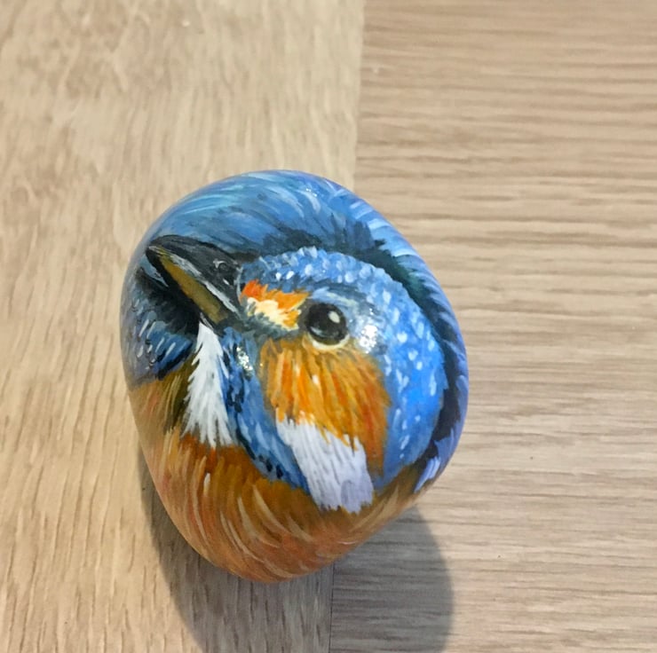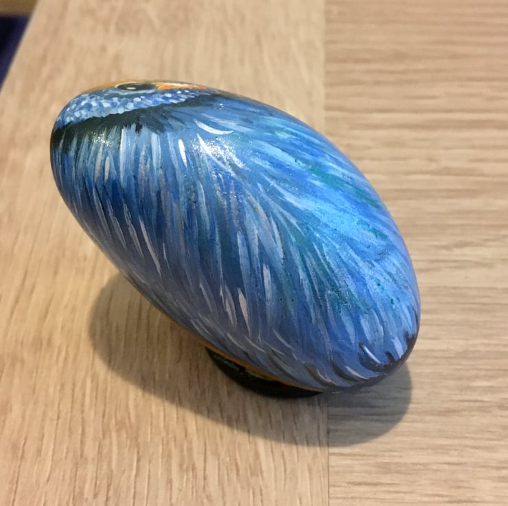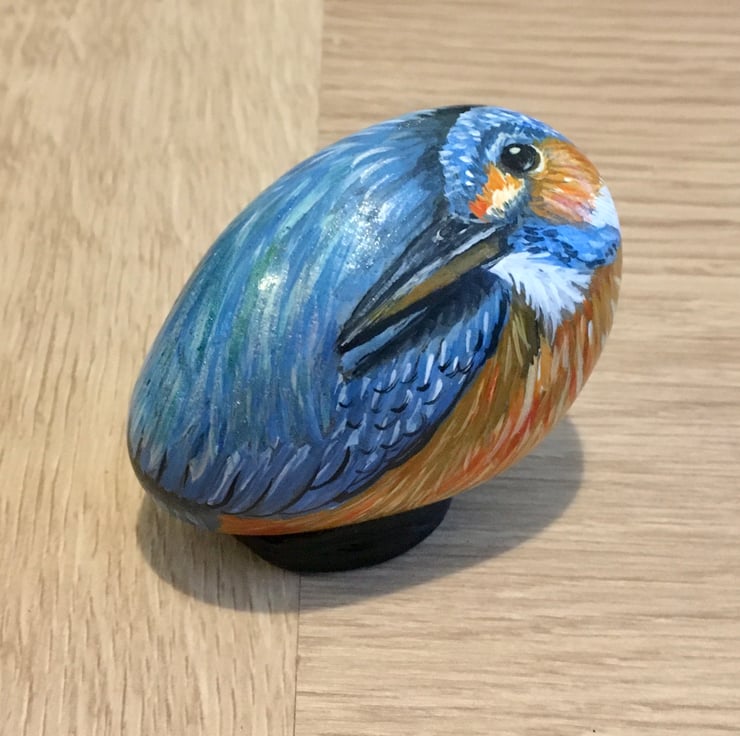 This kingfisher has been painted onto a smooth stone and glazed for a glossy protective finish