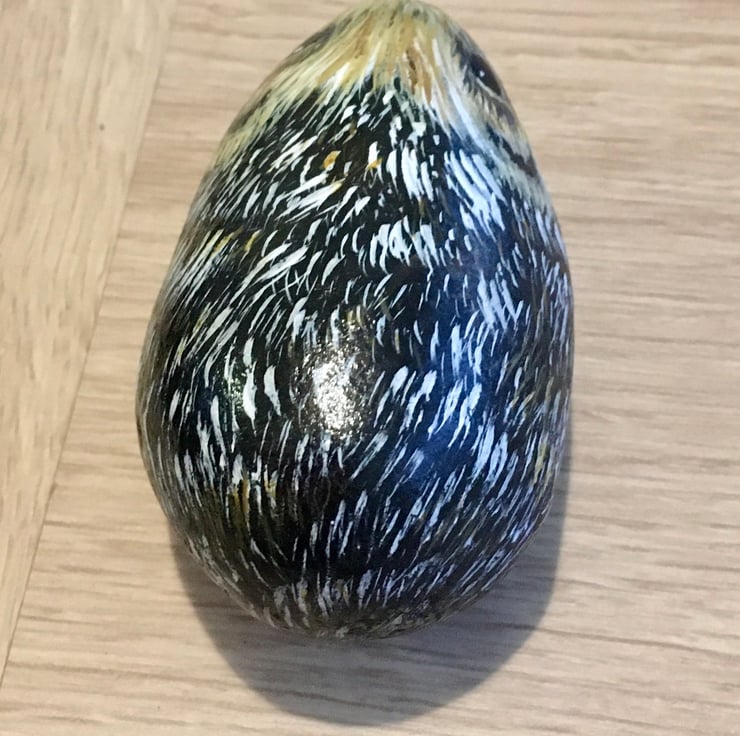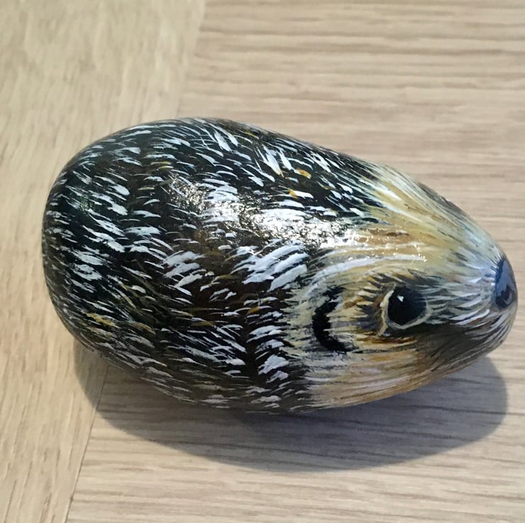 This hedgehog has been painted onto a smooth stone and glazed for a glossy protective finish