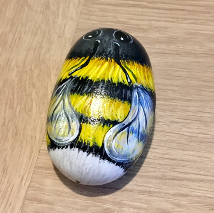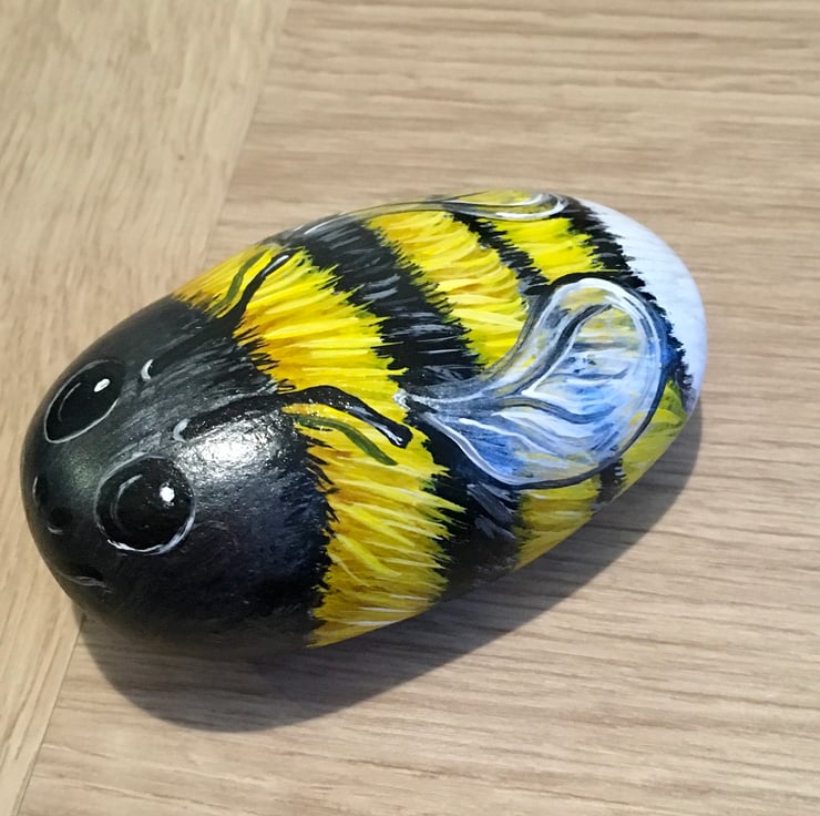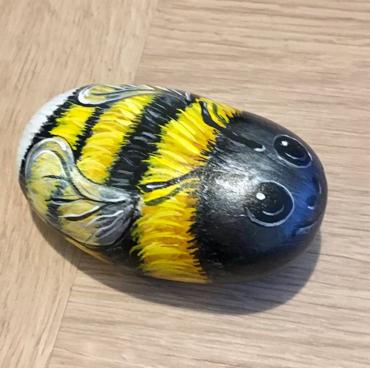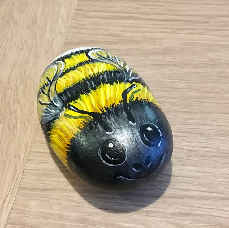 This bee has been painted on a smooth stone and glazed for a glossy protective finish
