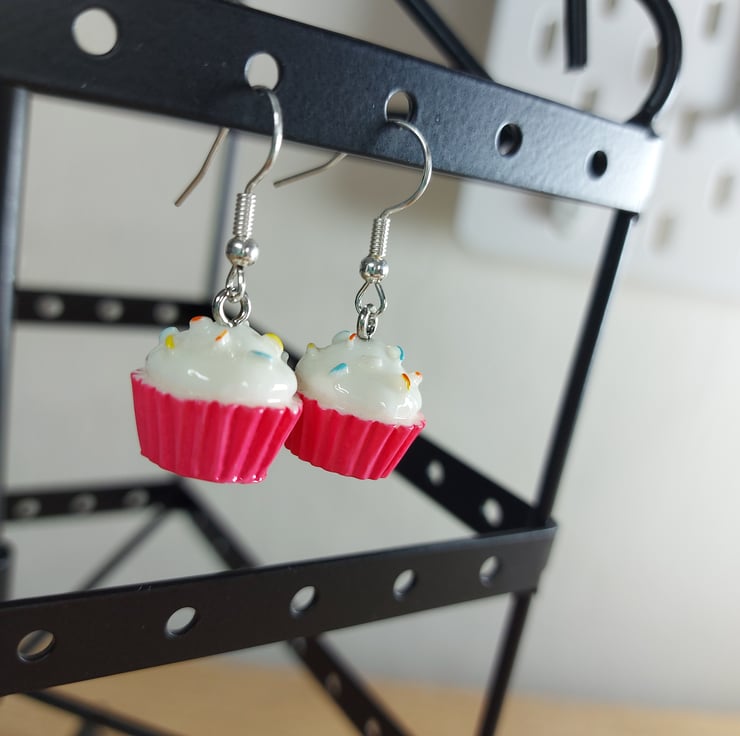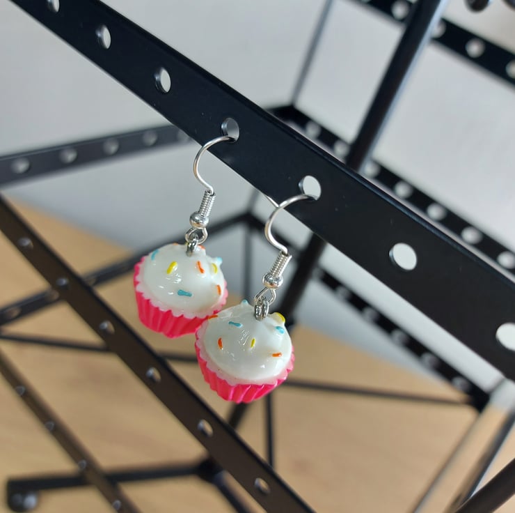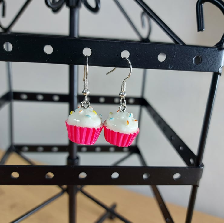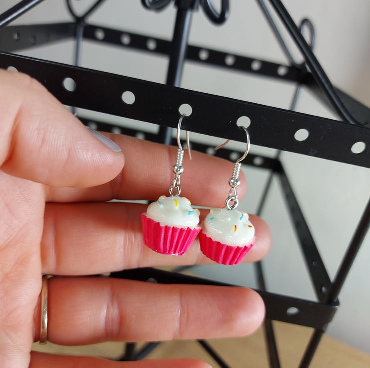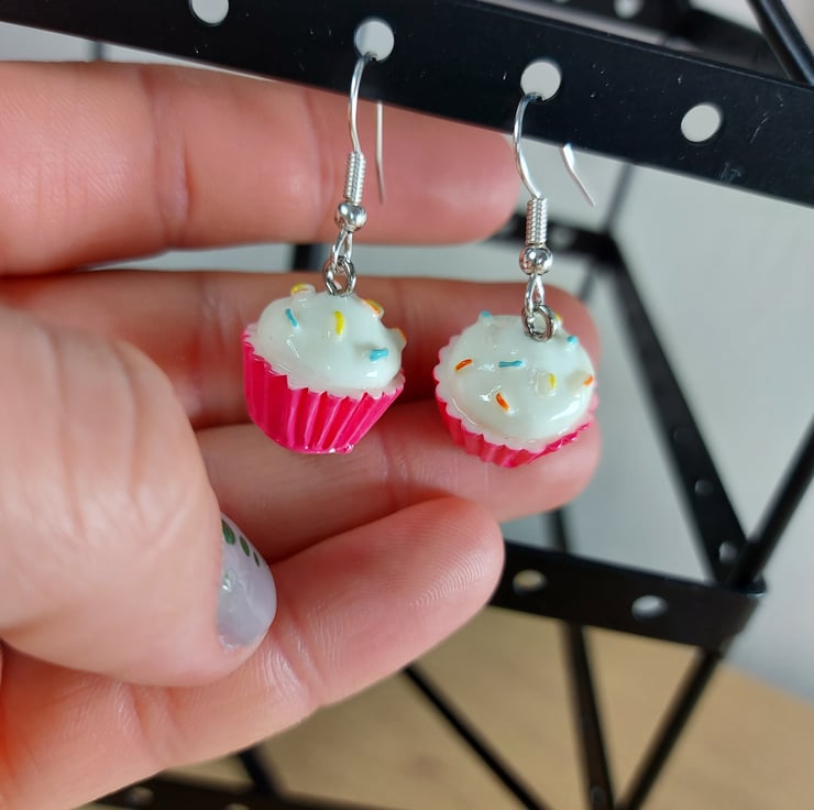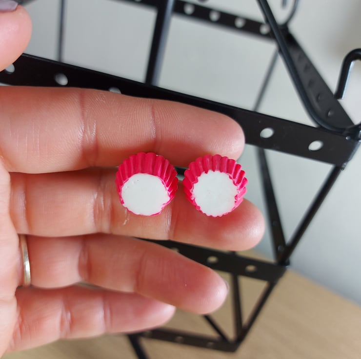 These statement dangley earring are a cute way to accessorise . These beautiful teenie tiny cup cakes in a pink cup case with white frosting have multi coloured sprinkles on top . I have one pair of these available and will not be able to restock these little cuties