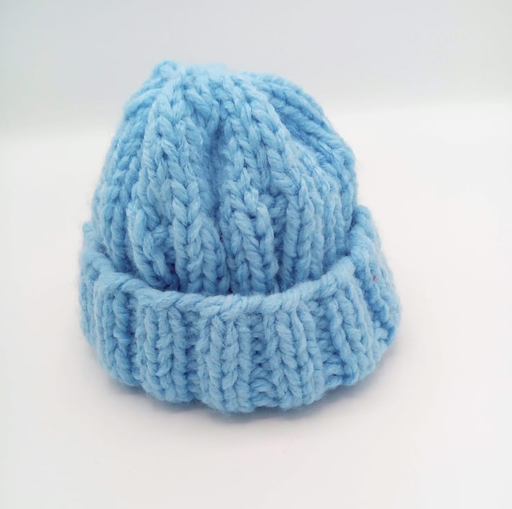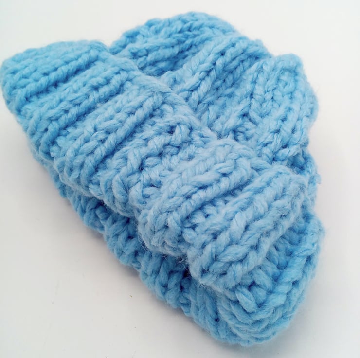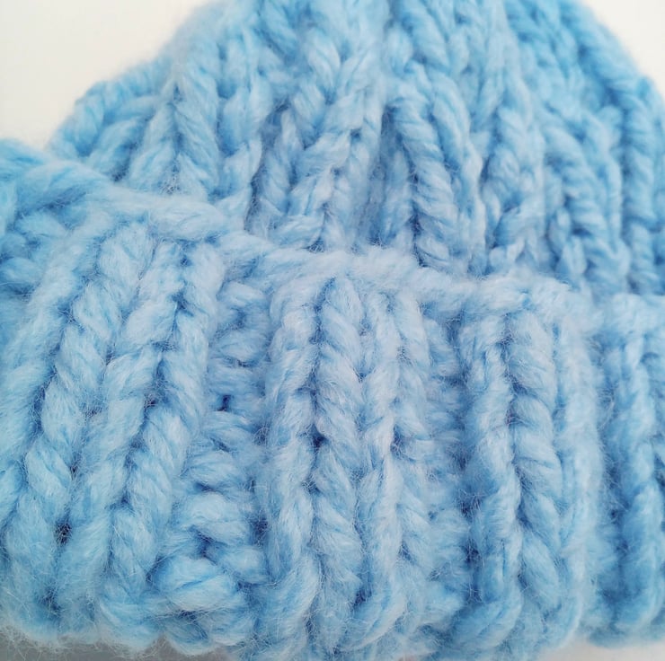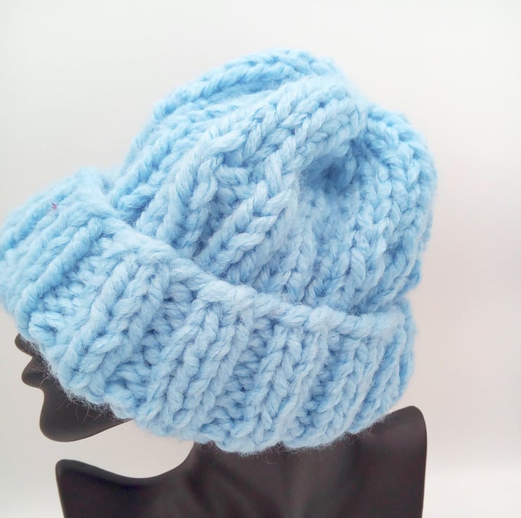 The hat shown is knitted in pale blue super chunky weight yarn. It is ideal for either a boy or girl to keep their heads warm on cold day. It is in stock in the blue shade shown to fit a 4 - 6 year old. Other sizes and prices are shown below. It can be posted to you in 1 - 3 working days but if you require a different colour or size then please allow 1 - 2 weeks processing time to produce it and post out to you. The available sizes and prices are shown below and please state colour required when you order.