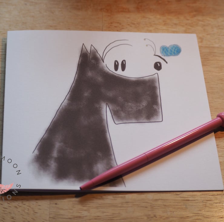 This adorable Scottie dog is making friends with a tartan butterfly which might or might not, land on his nose.