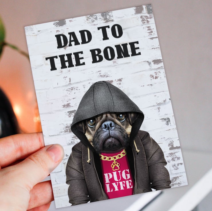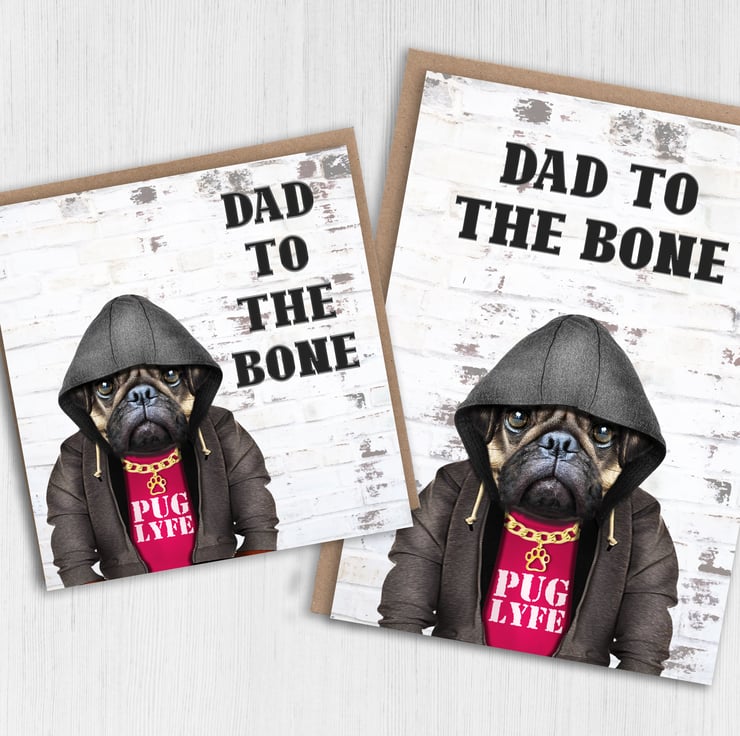 Pug in clothes, dog birthday card for dad, father, daddy, papa: Dad to the Bone (Animalyser)