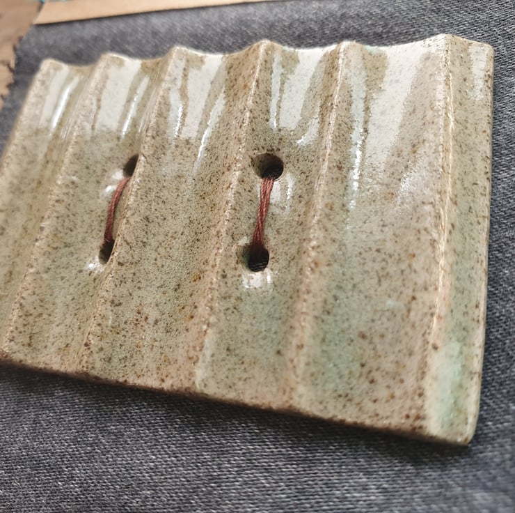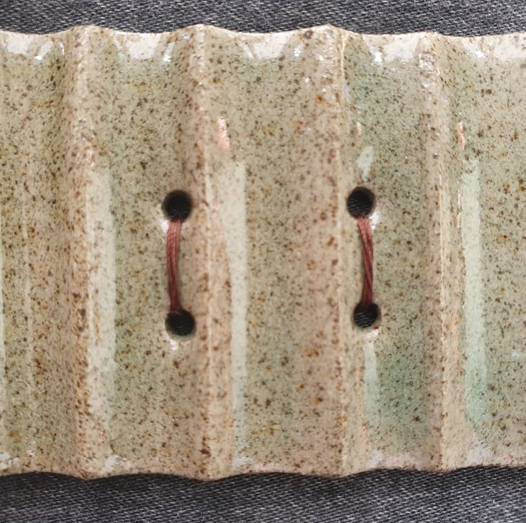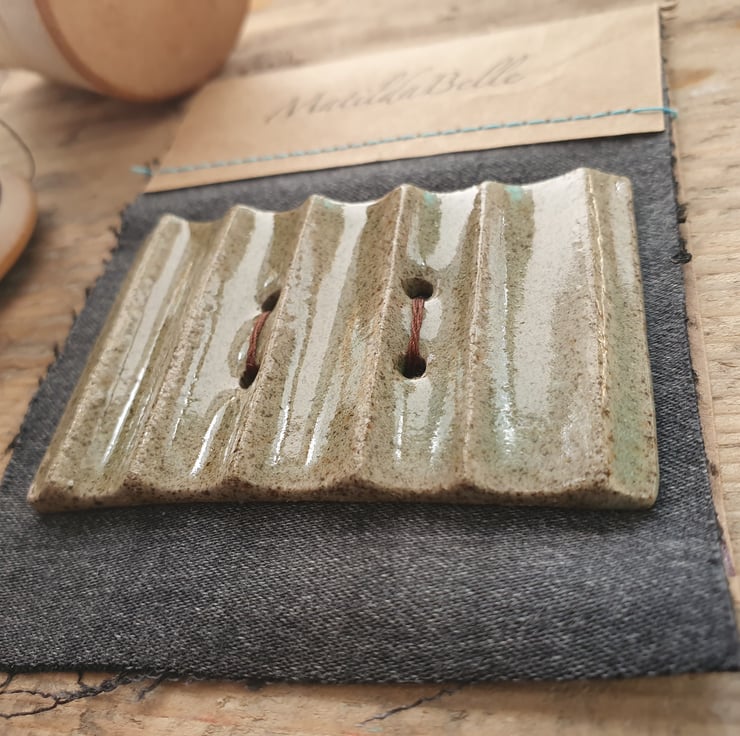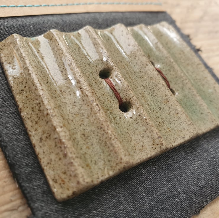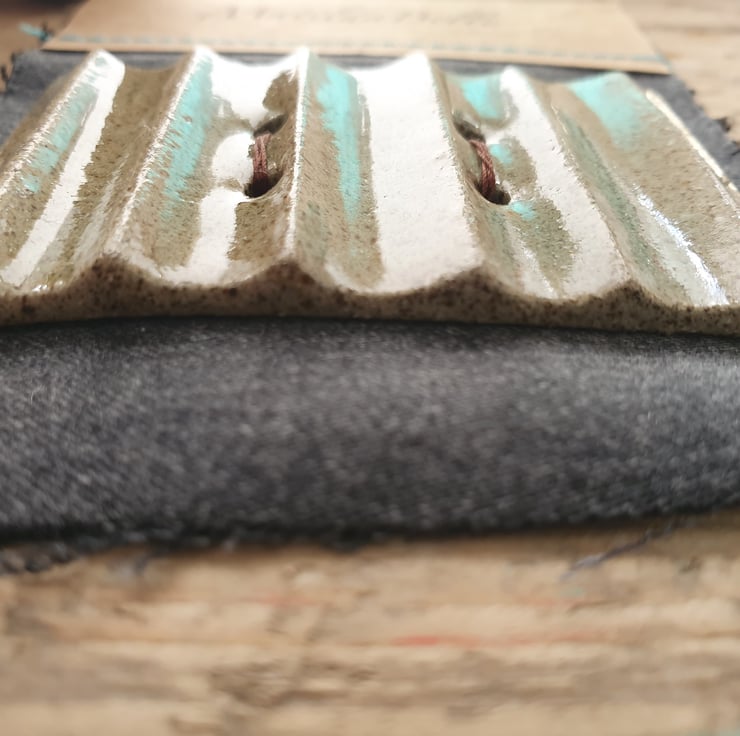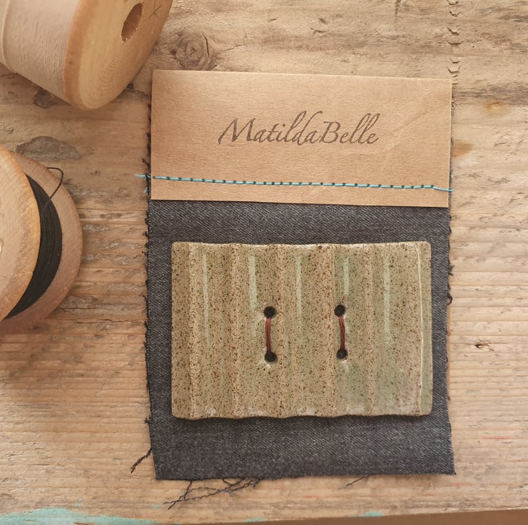 The stoneware clay is speckled and this is seen beautifully through the translucent high shine glaze on the rippled surface of the button. the reverse is left unglazed to allow the tactile nature of this clay to shine through and is complete with the MatildaBelle makers mark.