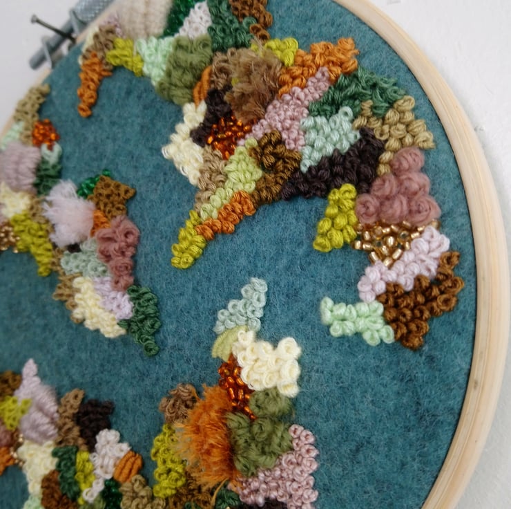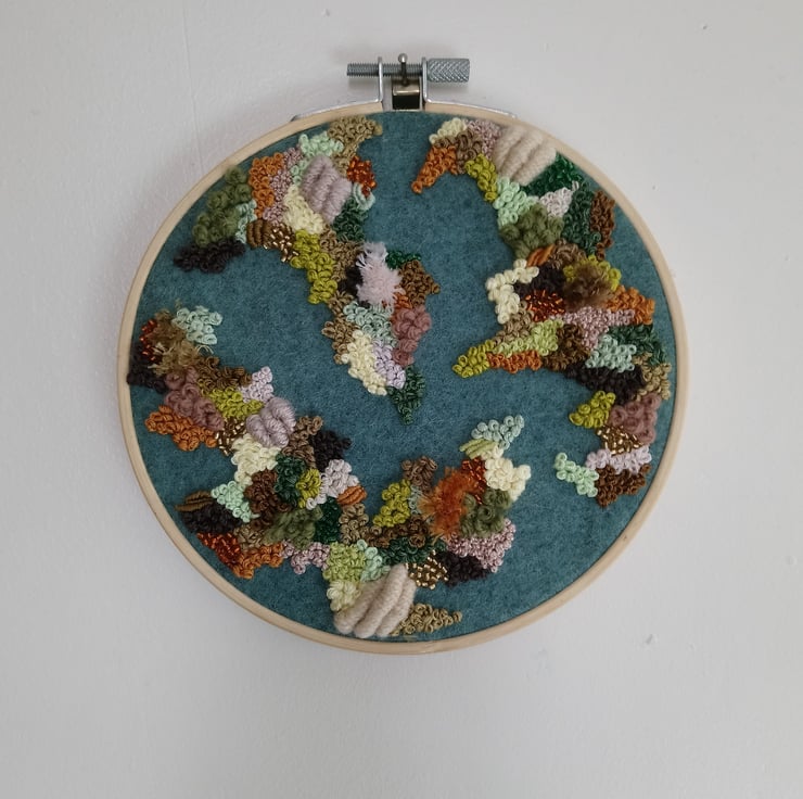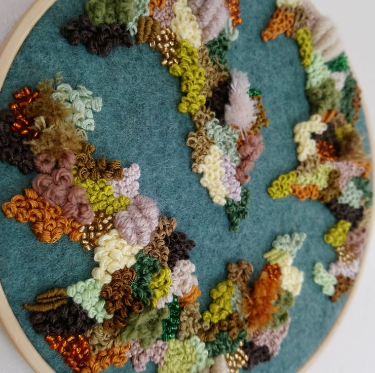 A 6 inch embroidery hoop containing an abstract piece of work completely handsewn onto a green acrylic mix wool using embroidery thread, yarn and beads. The mix of materials creates a unique textured look that is interesting to look at and pleasing to the eye. This piece is one of a kind and a perfect piece of home decor art either for your own home or as a gift to someone else.