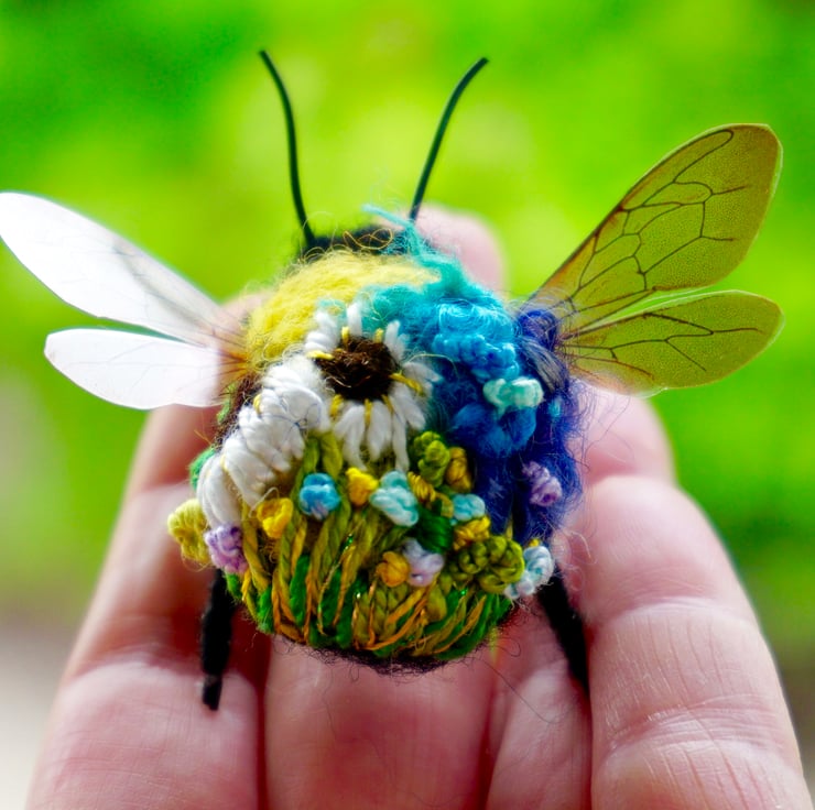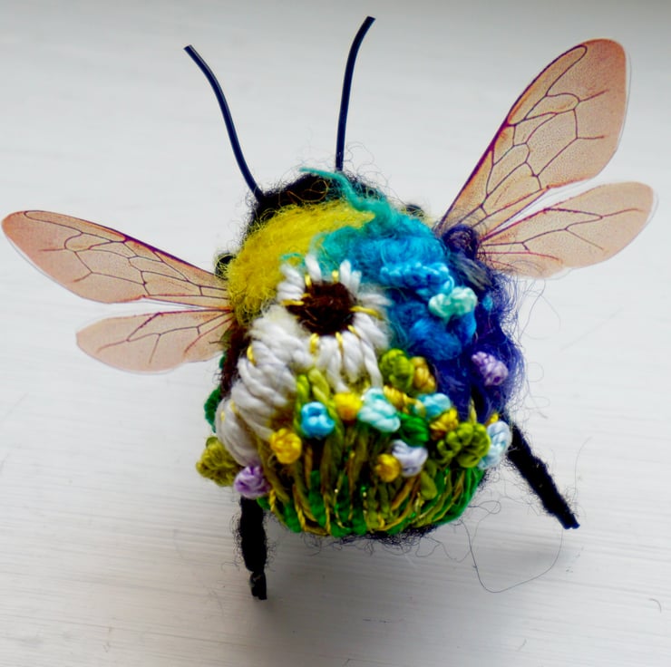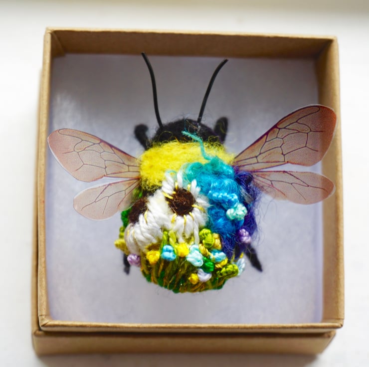 Needle felted and embroidered flower bee, measures approx 3 cm long by 5cm wide .Your bee will come with a fine gold hanging thread ,which can be snipped off if not required,Gift box included.This is actual bee you can purchase.