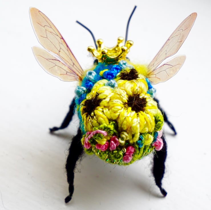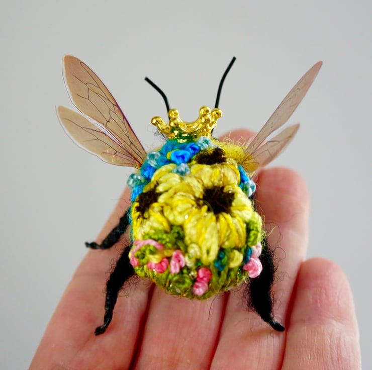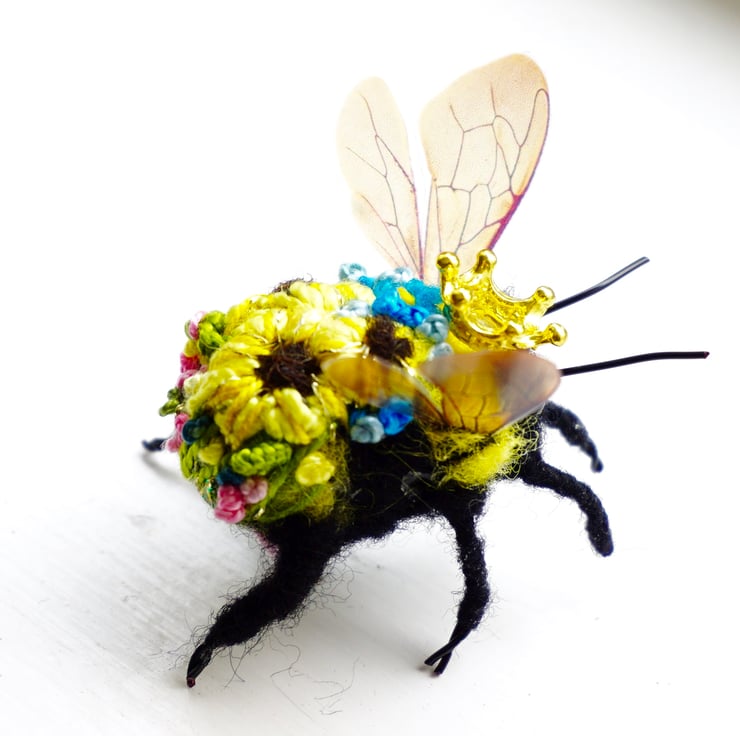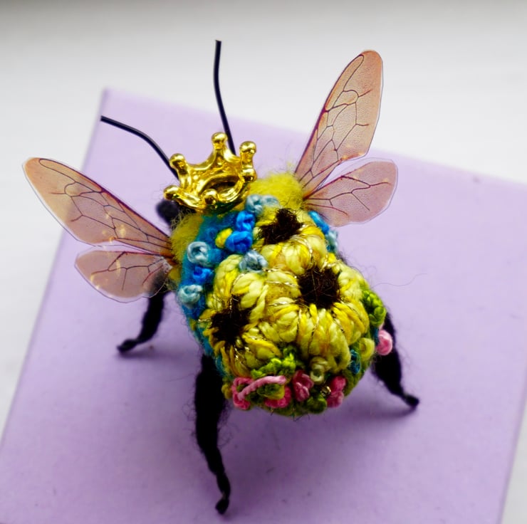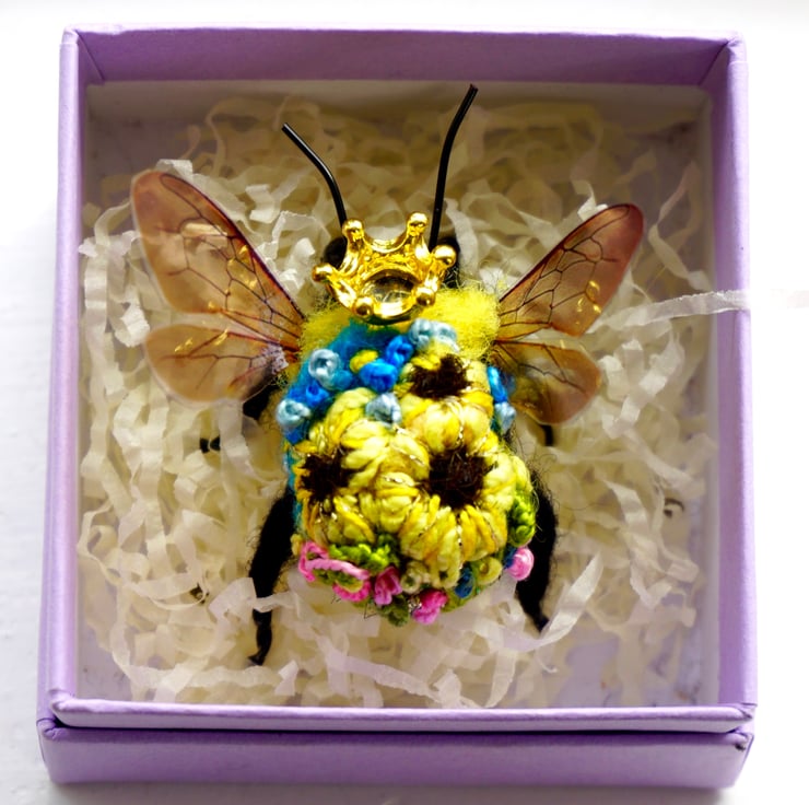 Needle felted and embroidered flower bee, measures approx 3 cm long by 5cm wide .Your bee will come with a fine gold hanging thread ,which can be snipped off if not required,Gift box included.This is actual bee you can purchase.