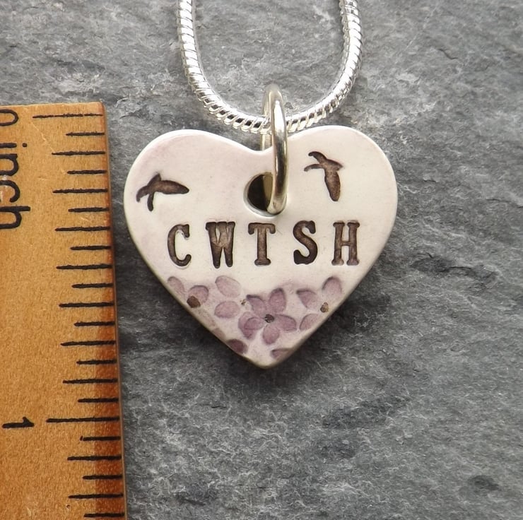 This heart-shaped pendant has 'Cwtsh' stamped into the wet clay, along with some flowers and tiny swallows.