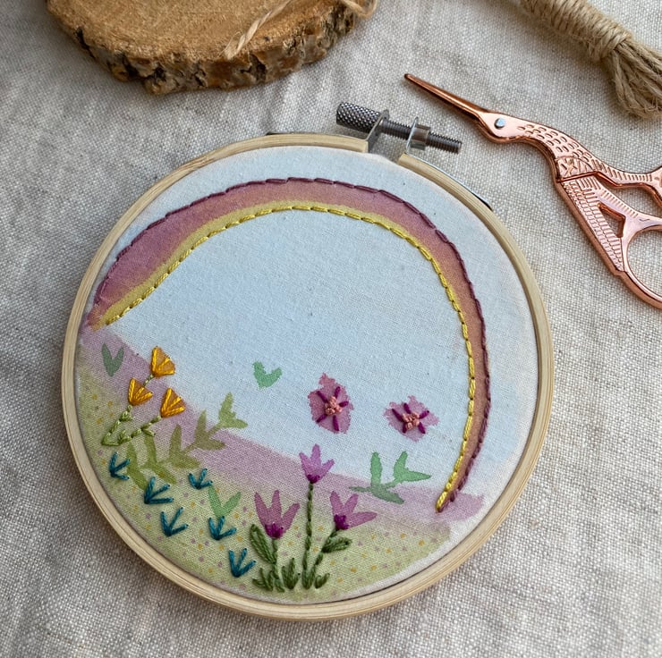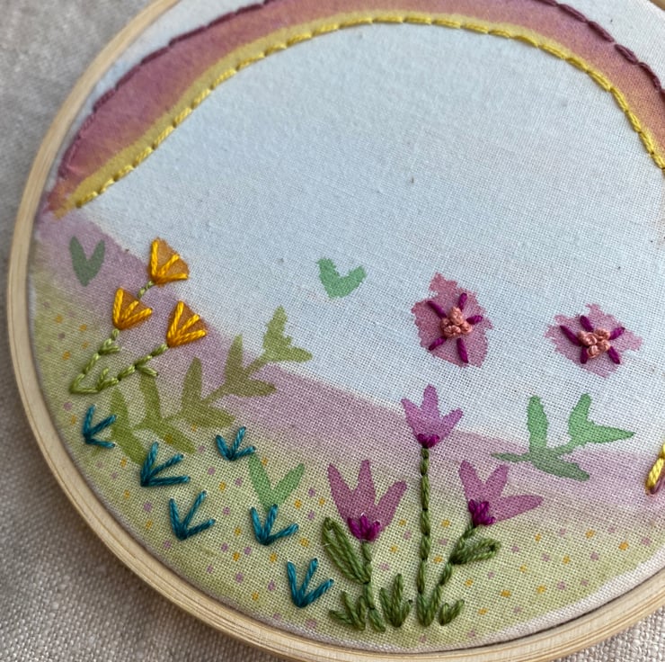 A beautiful 4 inch painted and embroidered wall art hoop in a bamboo hoop which features a rainbow over a floral landscape.