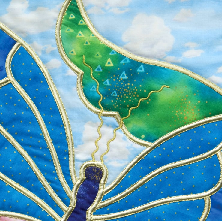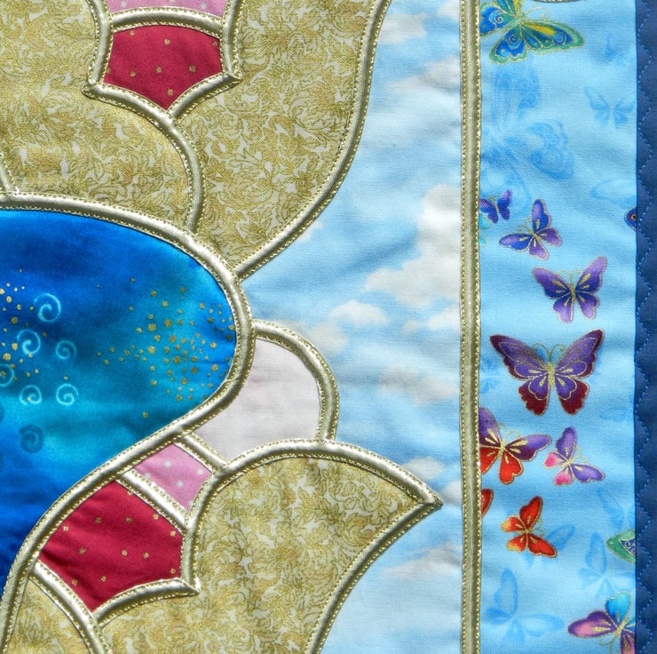 Gold machine embroidery creates the butterfly’s antennae, and the whole panel is backed and bound in plain royal blue, decorated with a wavy machine stitch.