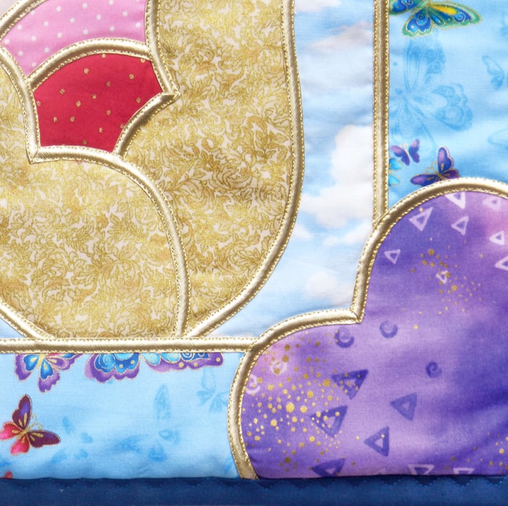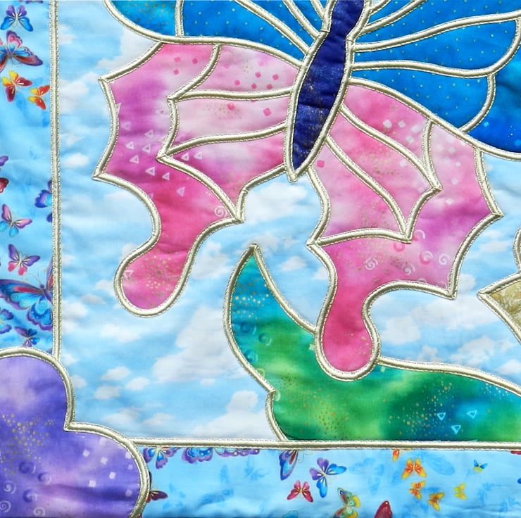 The background fabric is a blue-and-white cloud print, and the border features a drift of small brightly-coloured butterflies outlined in gold. The heart-shaped cornerpieces are created from a mauve and gold print fabric.
