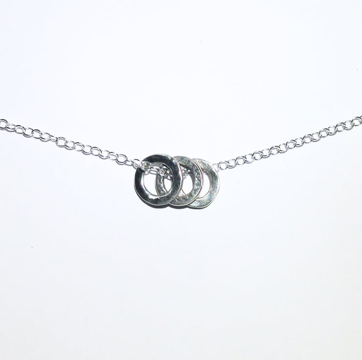 This beautiful necklace features 3 small handmade sterling silver hoops, two of which have been given a different hammered finish and one a hand stamped finish. I have created the necklace from sterling silver chain fastening with a handmade hammered sterling silver toggle clasp.