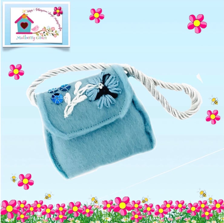 A cute little pale blue embroidered felt handbag, made especially for the Mulberry Green dolls to carry around all of their bits and pieces.