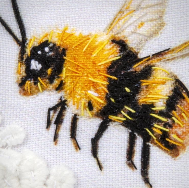 An embellished fabric print, carefully machine stitched and slightly padded, to give an unusual three-dimensional appearance. I have added the details with hand-embroidery.