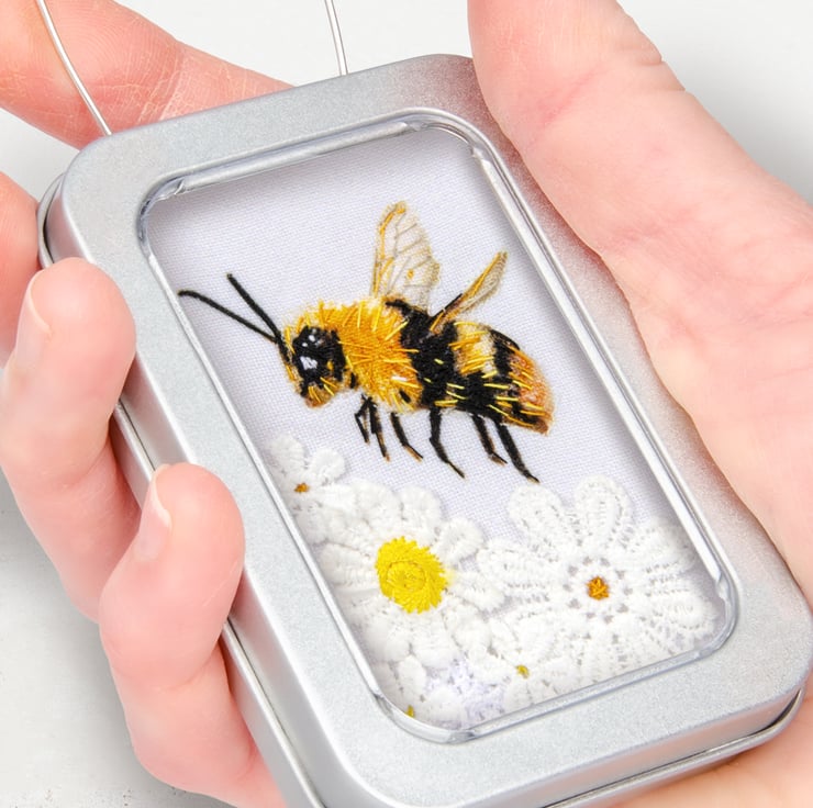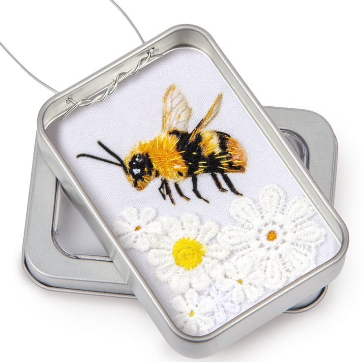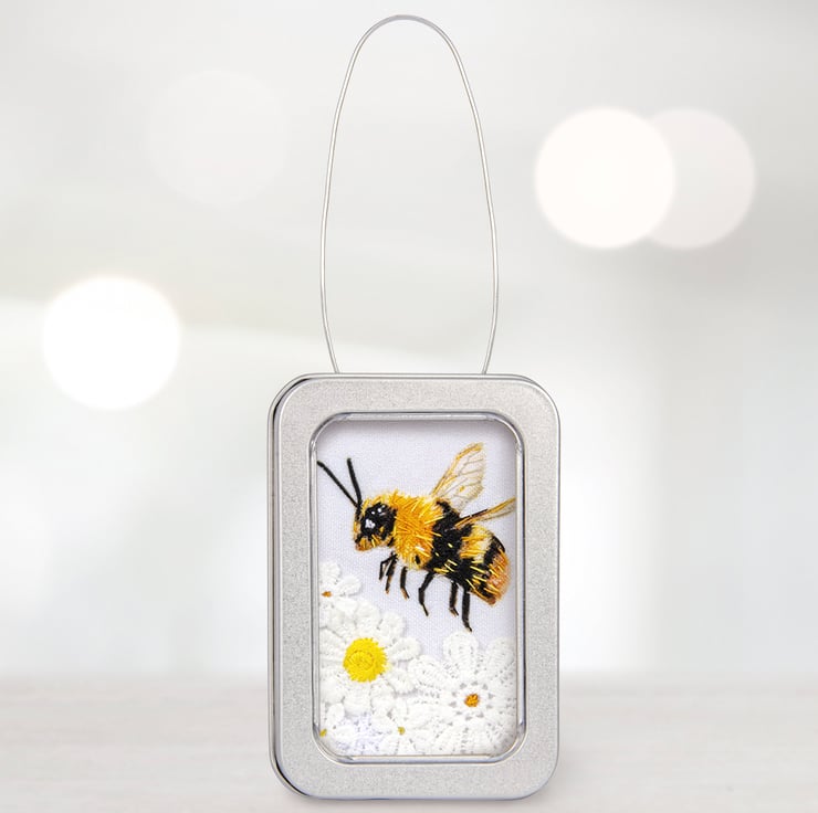 This is a little 3D fabric Bee, framed in a sturdy recyclable aluminium tin, with a wire hanger.