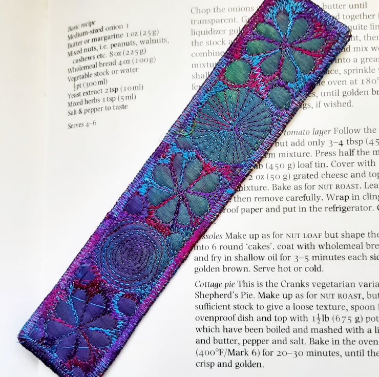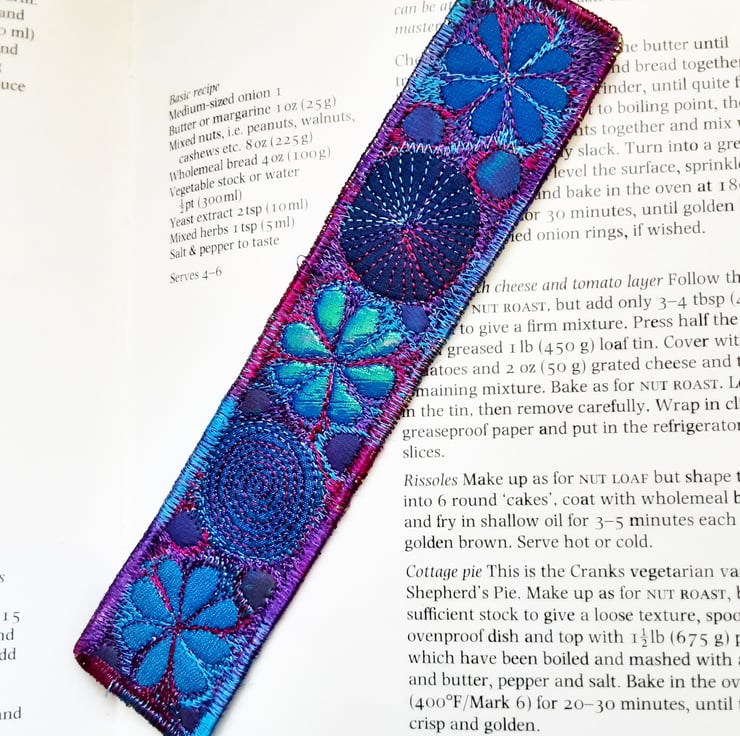 This is a handmade machine stitched fabric bookmark.