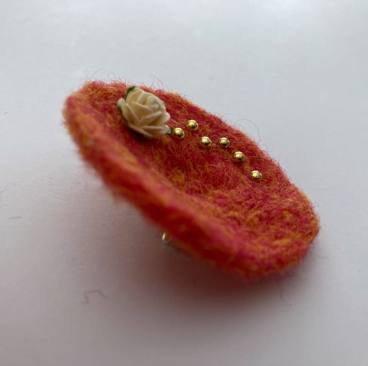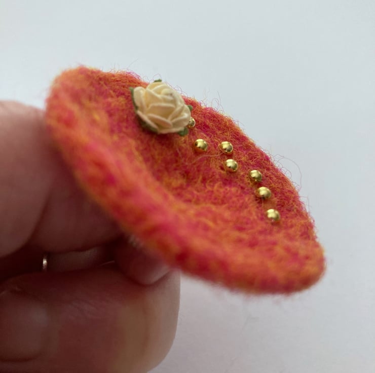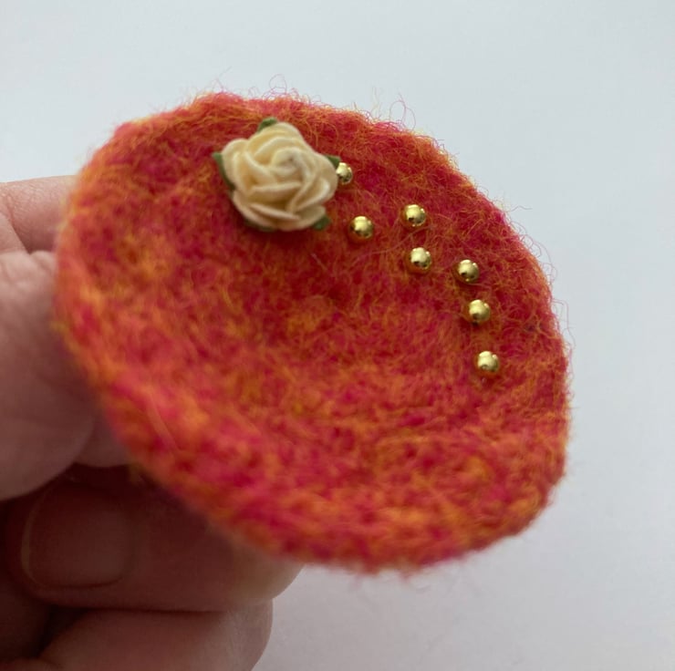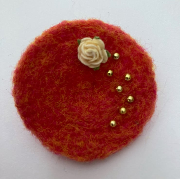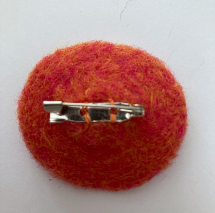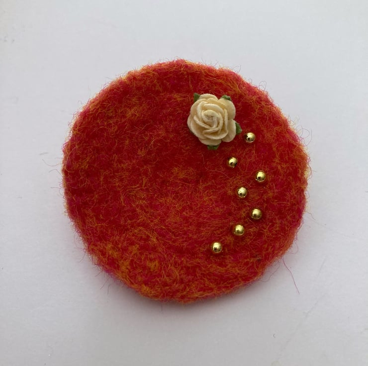 Orange woollen fibres have been needle felted into a circular shape to form the base of this brooch. A small cream coloured rose decoration and some small gold coloured half pearls have been added to the surface and a silver tone brooch pin attached to the reverse. The brooch measures approximately 5cm in diameter and is slightly concave in shape. This pretty brooch would be a lovely addition to any outfit, smart or casual.