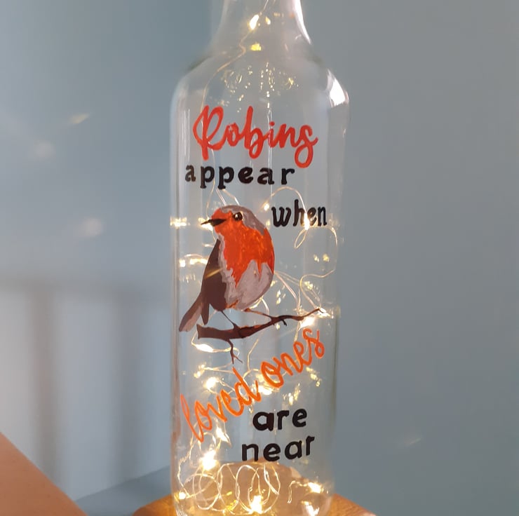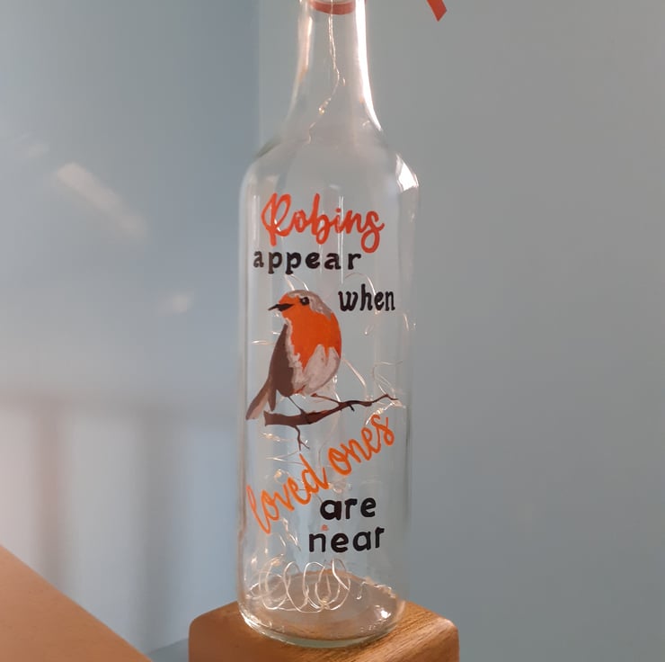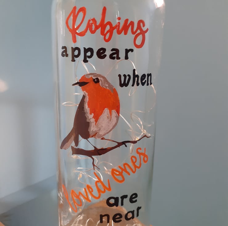 My hand painted robin sits proudly on this up-cycled glass bottle and the words around him say