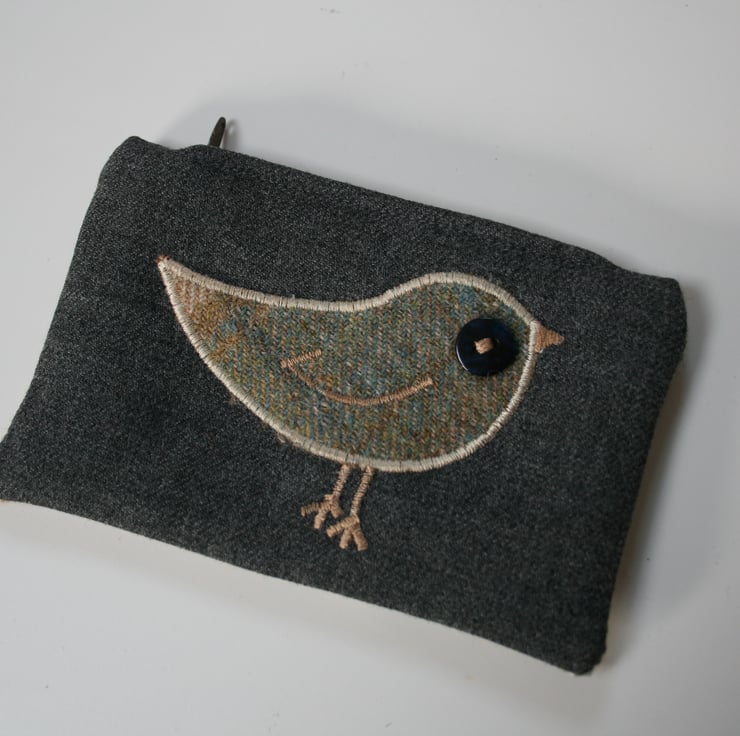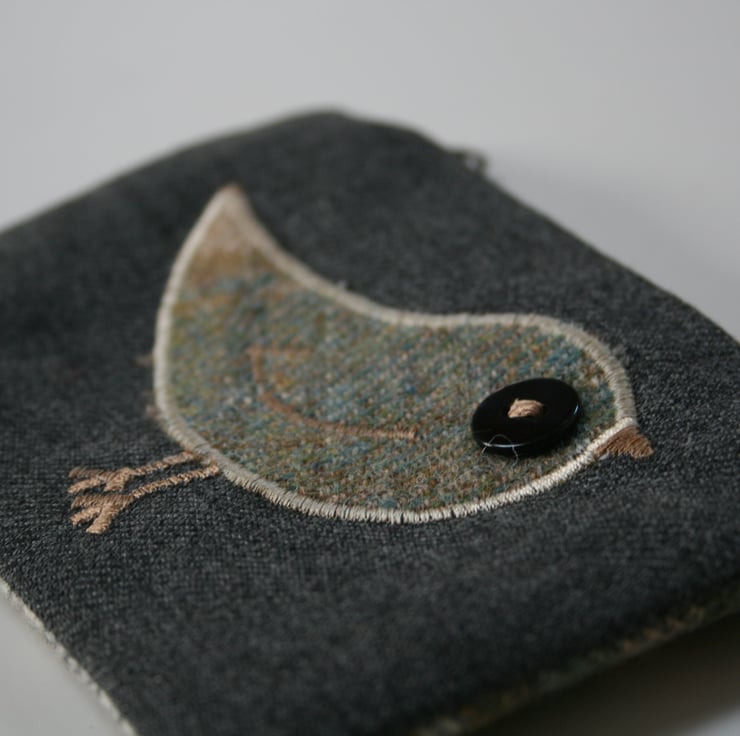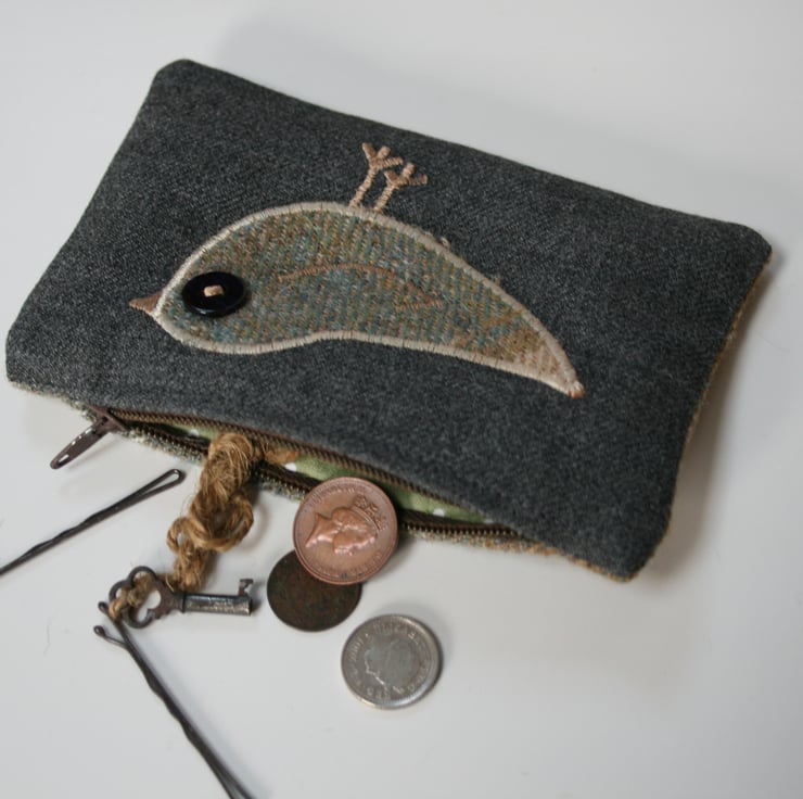 So, a little birdie told me to do something with some lovely offcuts of tweed fabric that I have. A quirkl little tweed coin purse/wallet with a tweed bird applique and polkadot lining is the result! Zip fastening, fully tweed on the reverse. The bird has a little button eyes that looks inky black but has a subtle royal blue shimmer in bright light, which I think gives it a slightly quizzical expression.