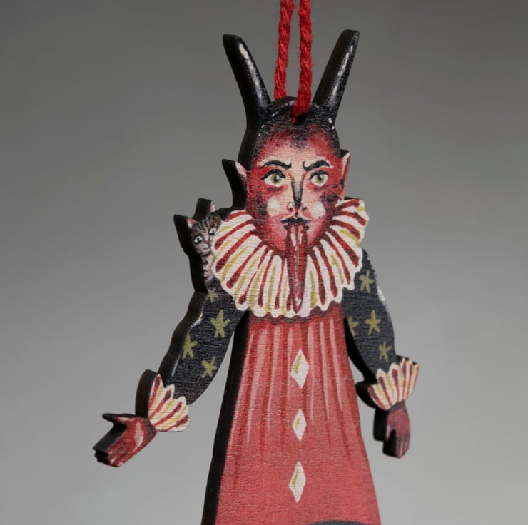 Rowan features on both sides of the decoration making him ideal for displaying on a twig tree. Can be used for all year round display (perfect for Halloween) and he could even be used on the tree at Christmas time (think Christmas Krampus!) Why not perch him on a shelf, hang from a mantlepiece, lampshade, and could even be displayed on a wall as a piece of art.