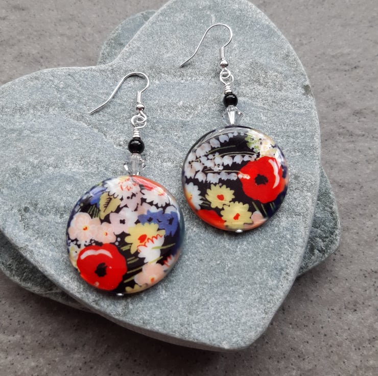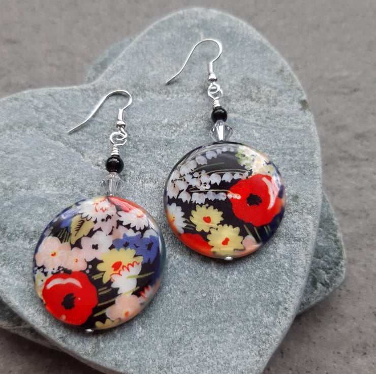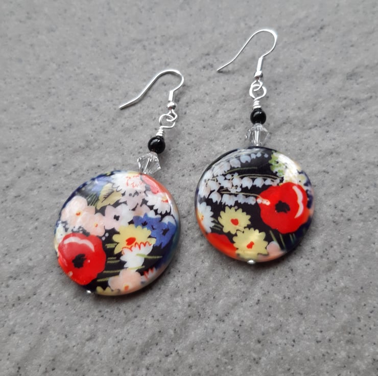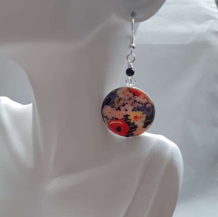 Round shaped mother of pearl with a flower pattern, swarovski® crystals and small black agate are attached to silver plated ear wires