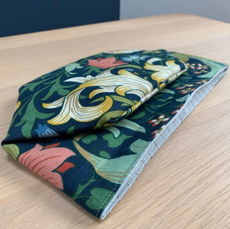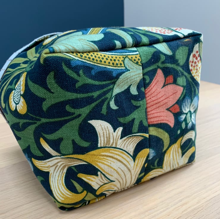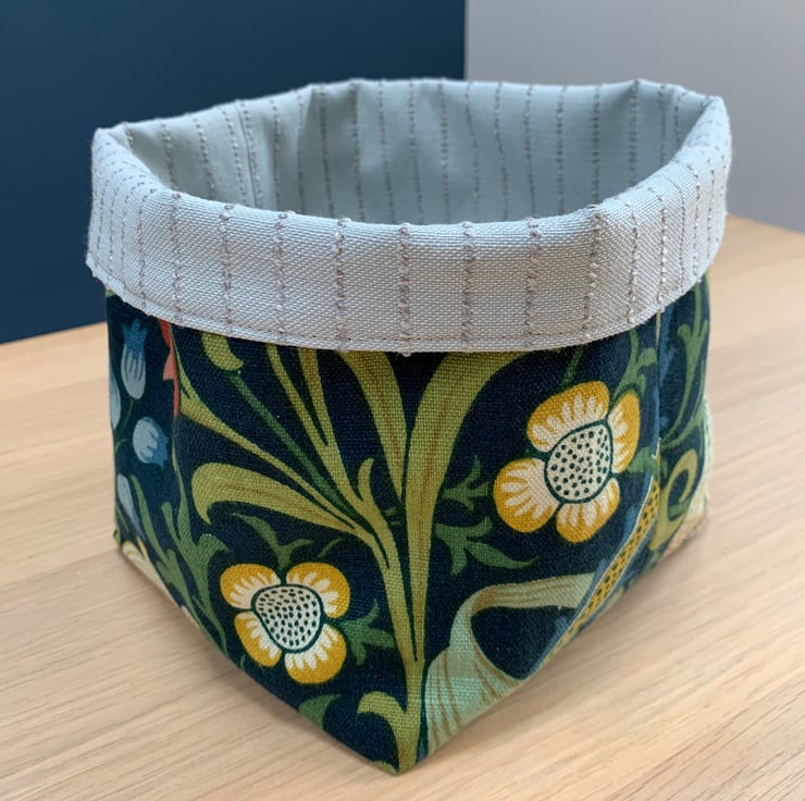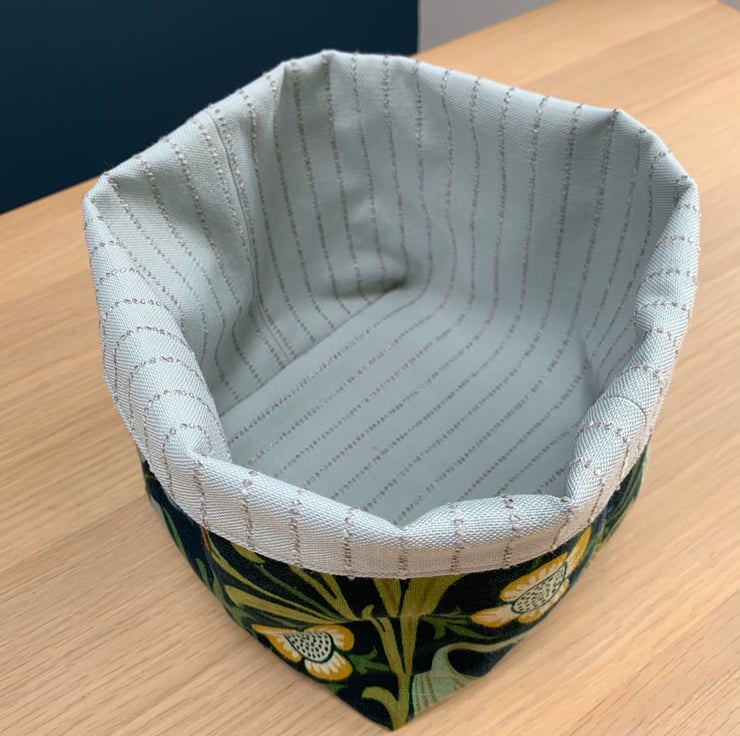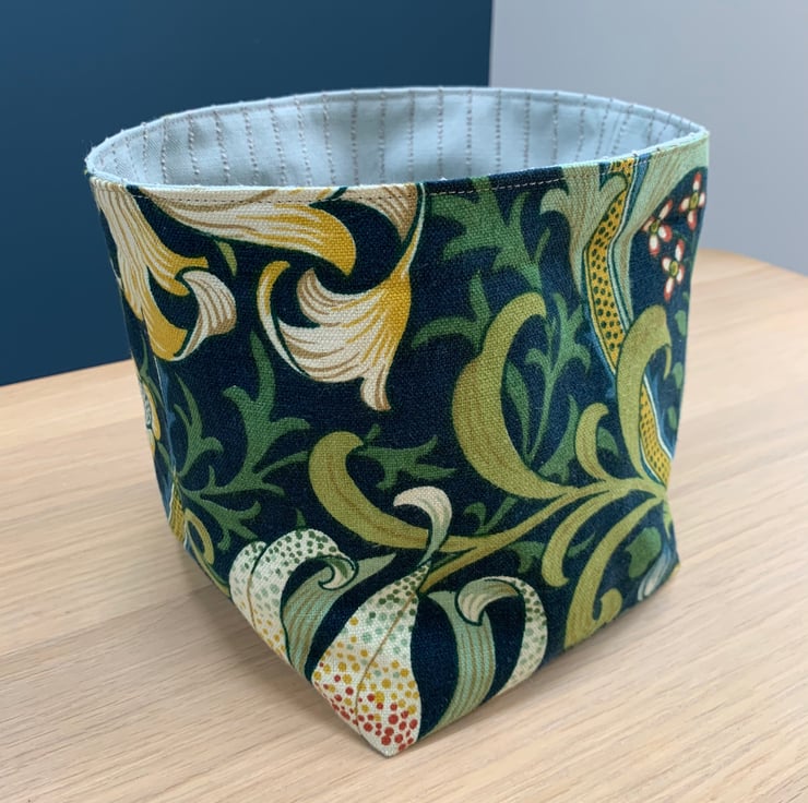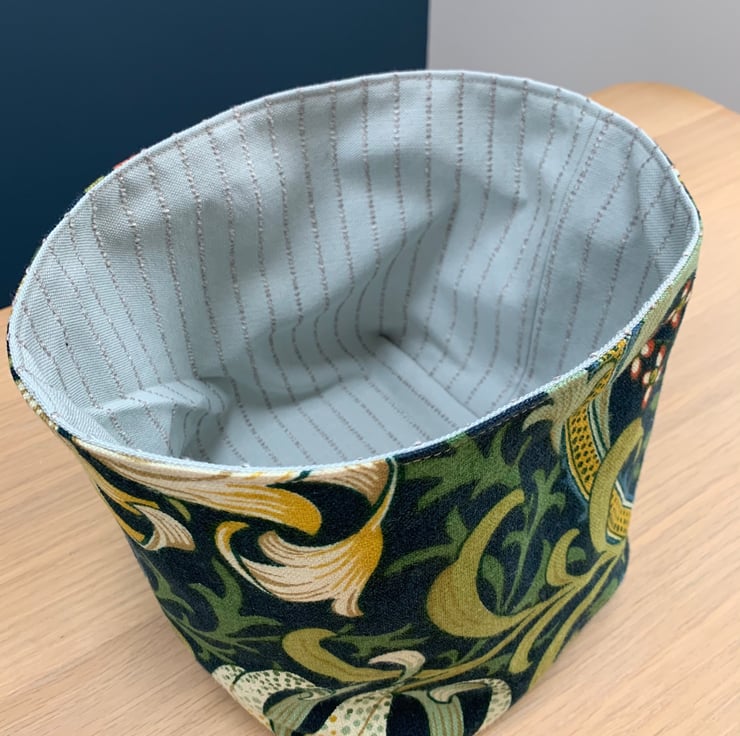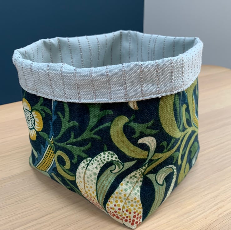 Reversible fabric storage basket made from William Morris Golden Lily linen with a dark teal background and a pale blue fabric with a textured pin stripe. Can be used with a turn-down to make the most of the contrasting fabrics.