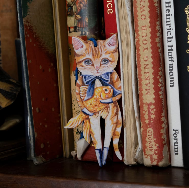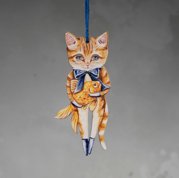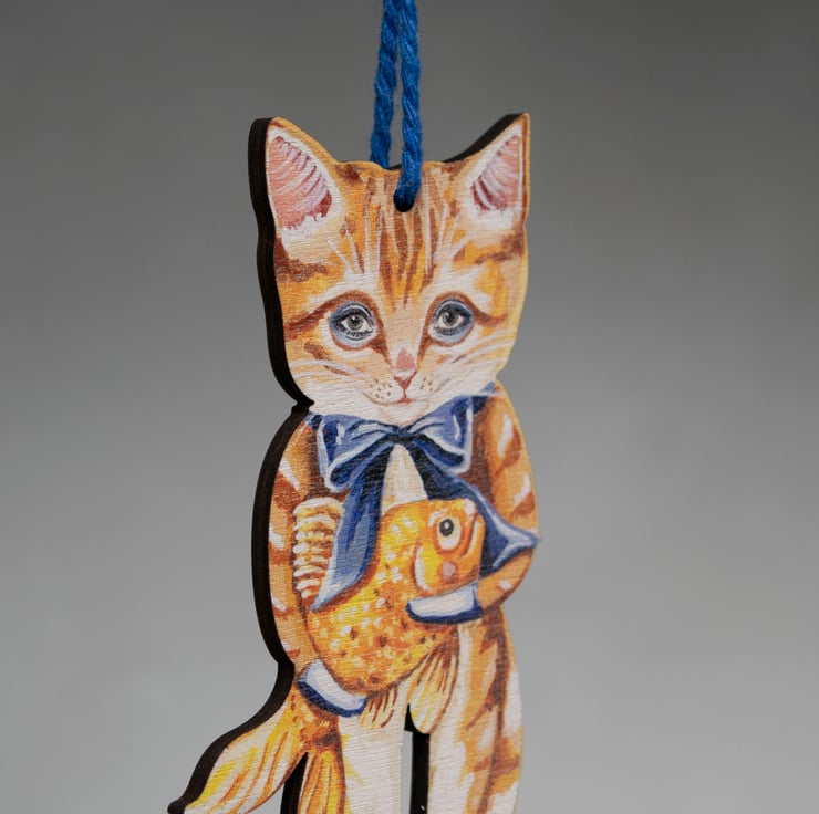 Wooden hanging decoration of a ginger cat called Simon with a goldfish