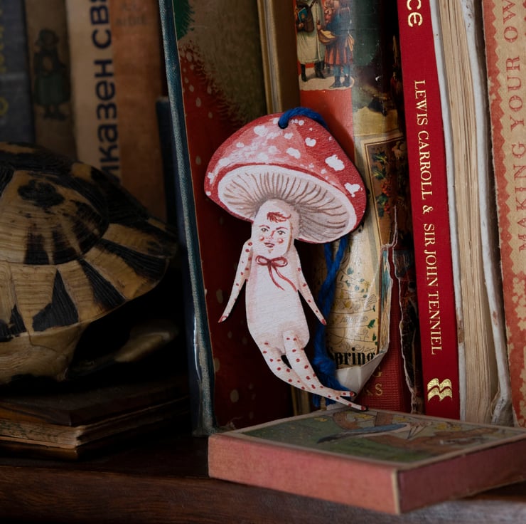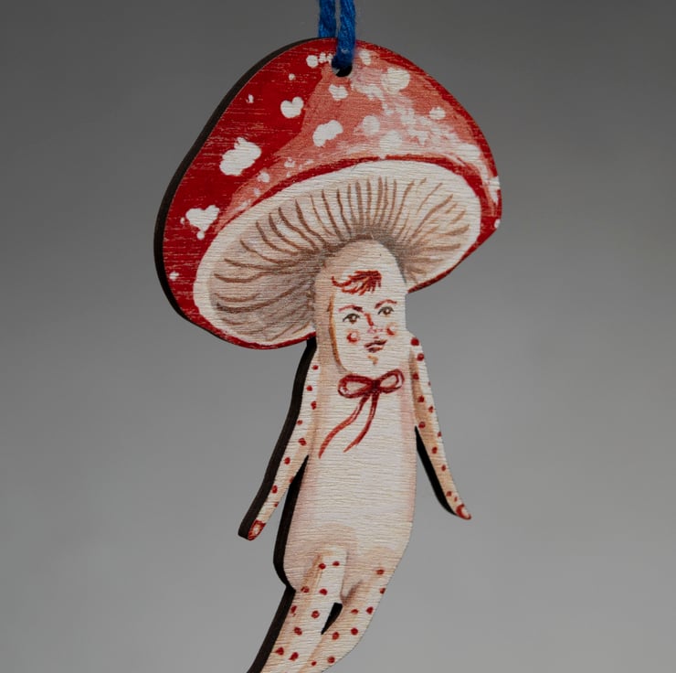 This is Wilder the mushroom man who is a double sided wooden hanging decoration, featuring my own artwork.