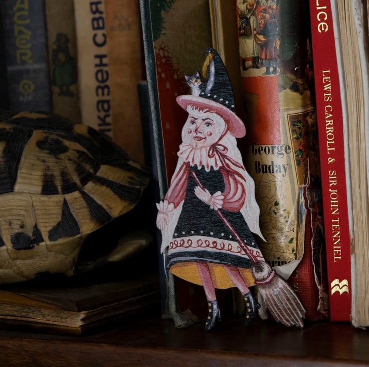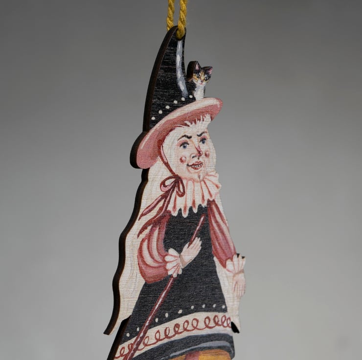 This is Helen the witch with her companion Marmalade (can you spot her?) Helen is my own artwork, and is a double sided wooden hanging decoration.