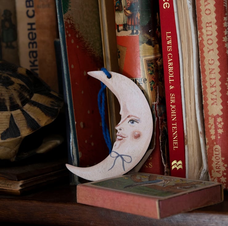 This charming moon fellow goes by the name of Apollo. Apollo is my own artwork, and is a double sided wooden hanging decoration.