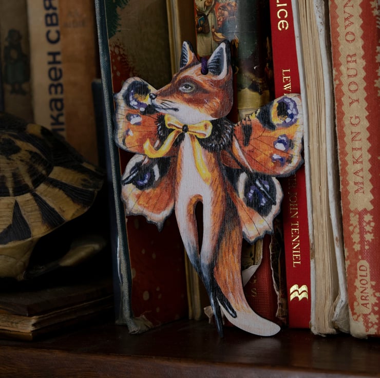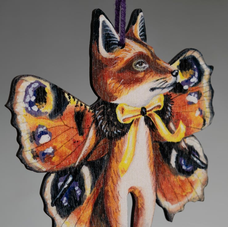 An eccentric wooden decoration of a fox butterfly named Kevin. Kevin is my own artwork, and is gloriously double sided. What a luxury!