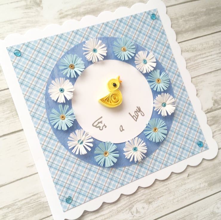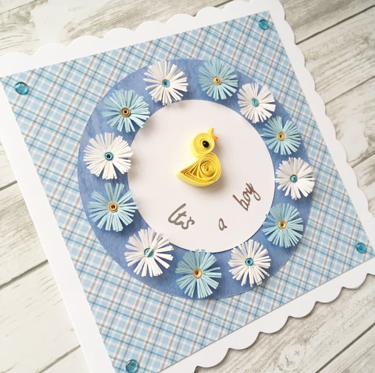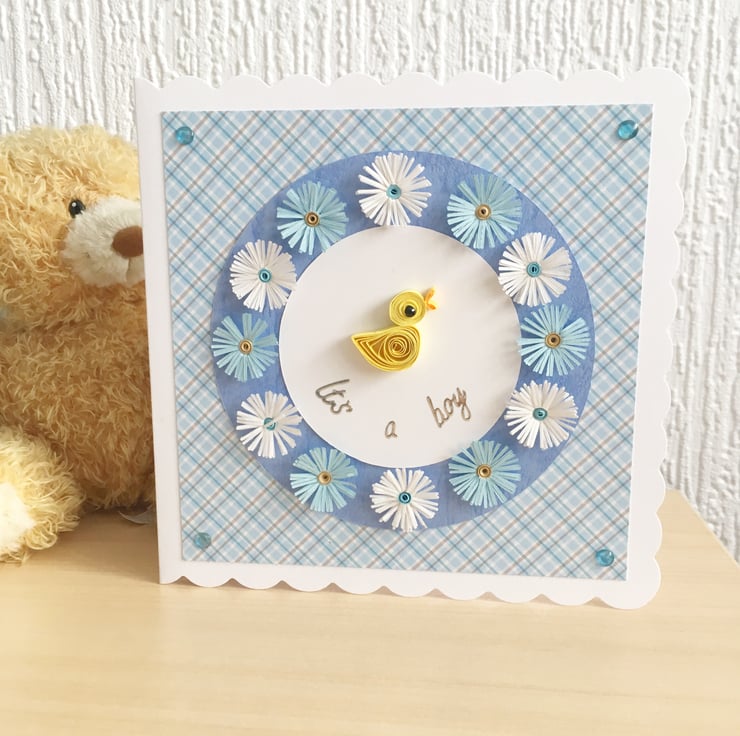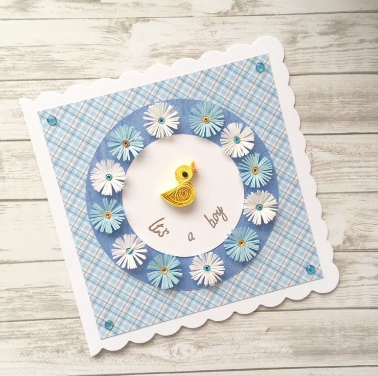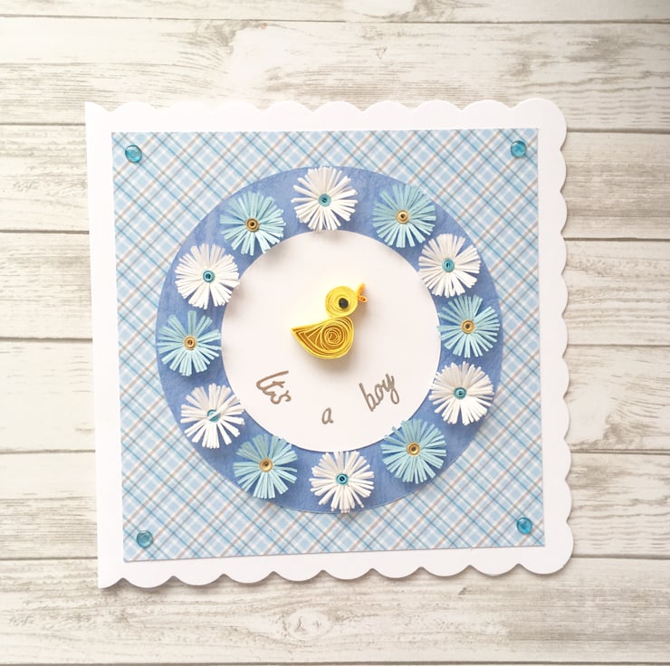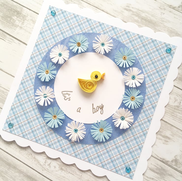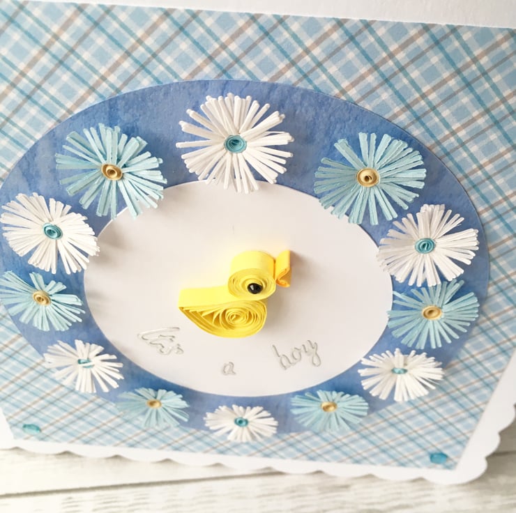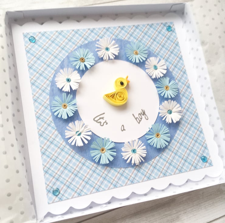 A lovely hand-quilled card to celebrate the birth of a new baby boy with the option to add a decorated gift box if desired.
