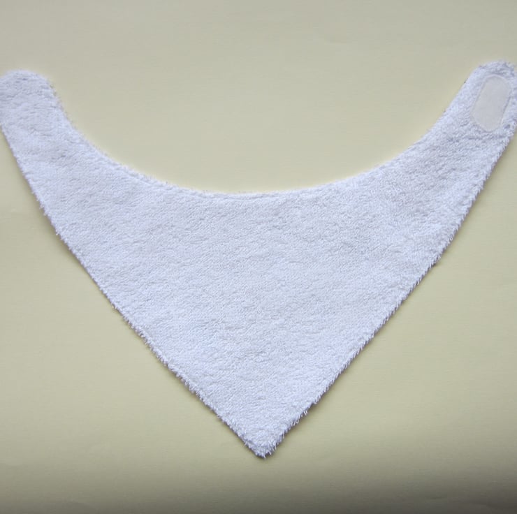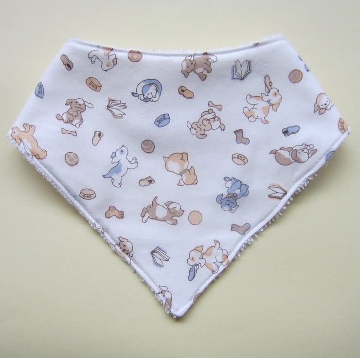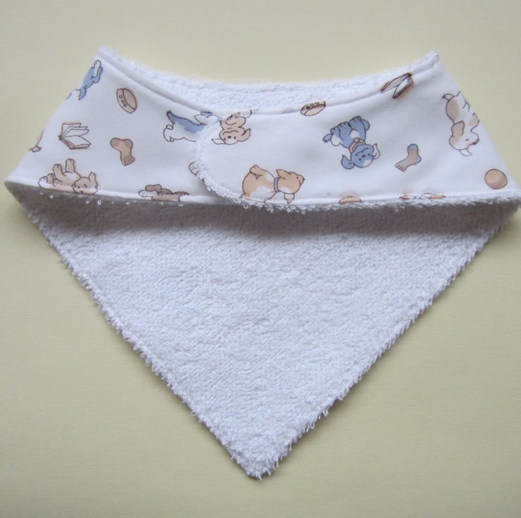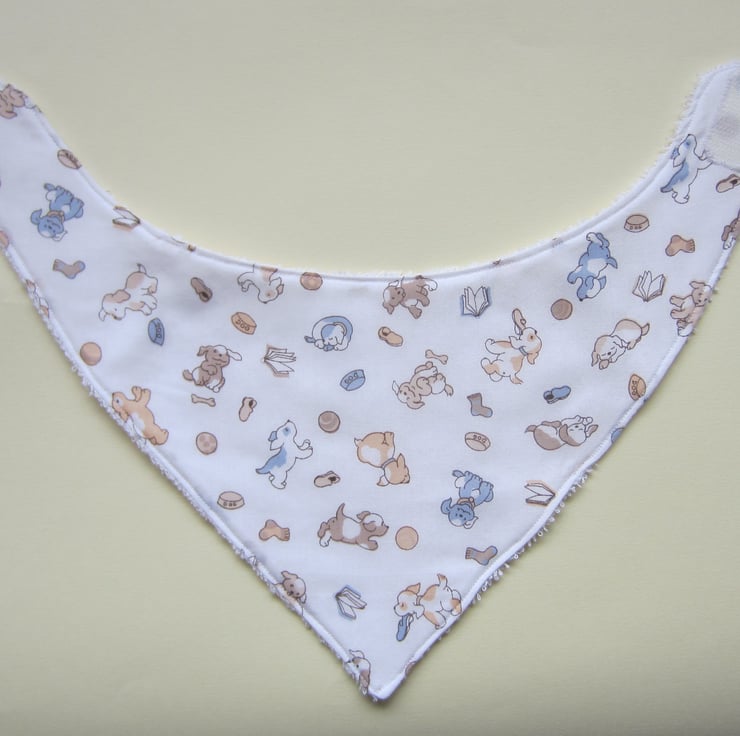 Babies bandana bib in cute puppy dog fabric, backed with soft white towelling for extra protection. At the back there is a 3.5 cm velcro fastening to give a good fit.