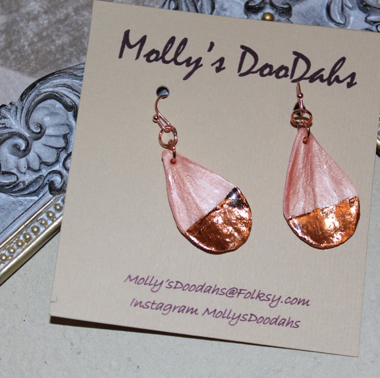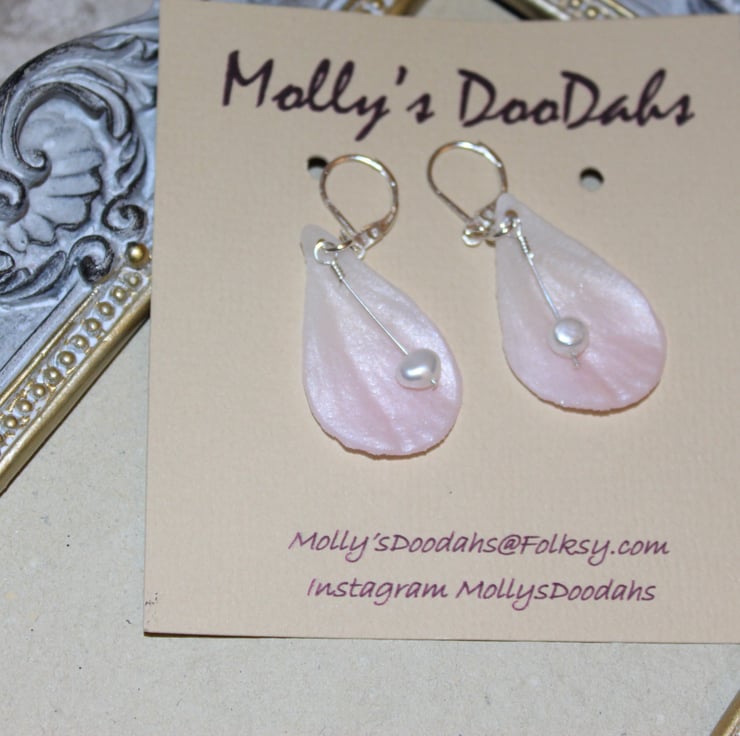 Delicate imitation rose petal with freshwater Pearl or gold leaf. Sterling silver findings. Handmade and ombré designs to appear as a natural rose petal. Pink, bronze. Resin coated on some for added shine. One of each design.